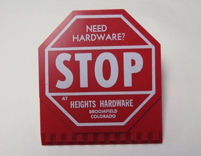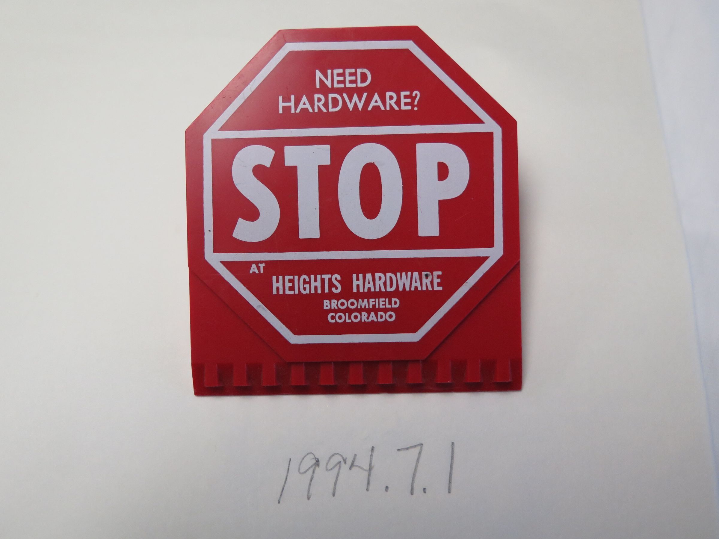 This red plastic ice scraper is from "Heights Hardware/Broomfield/Colorado." Designed to look like a stop sign, the scraper has a clip for clamping on to a car's visor. It measures 1.5" (h) x 3.5" (w) x 4.25" (l).