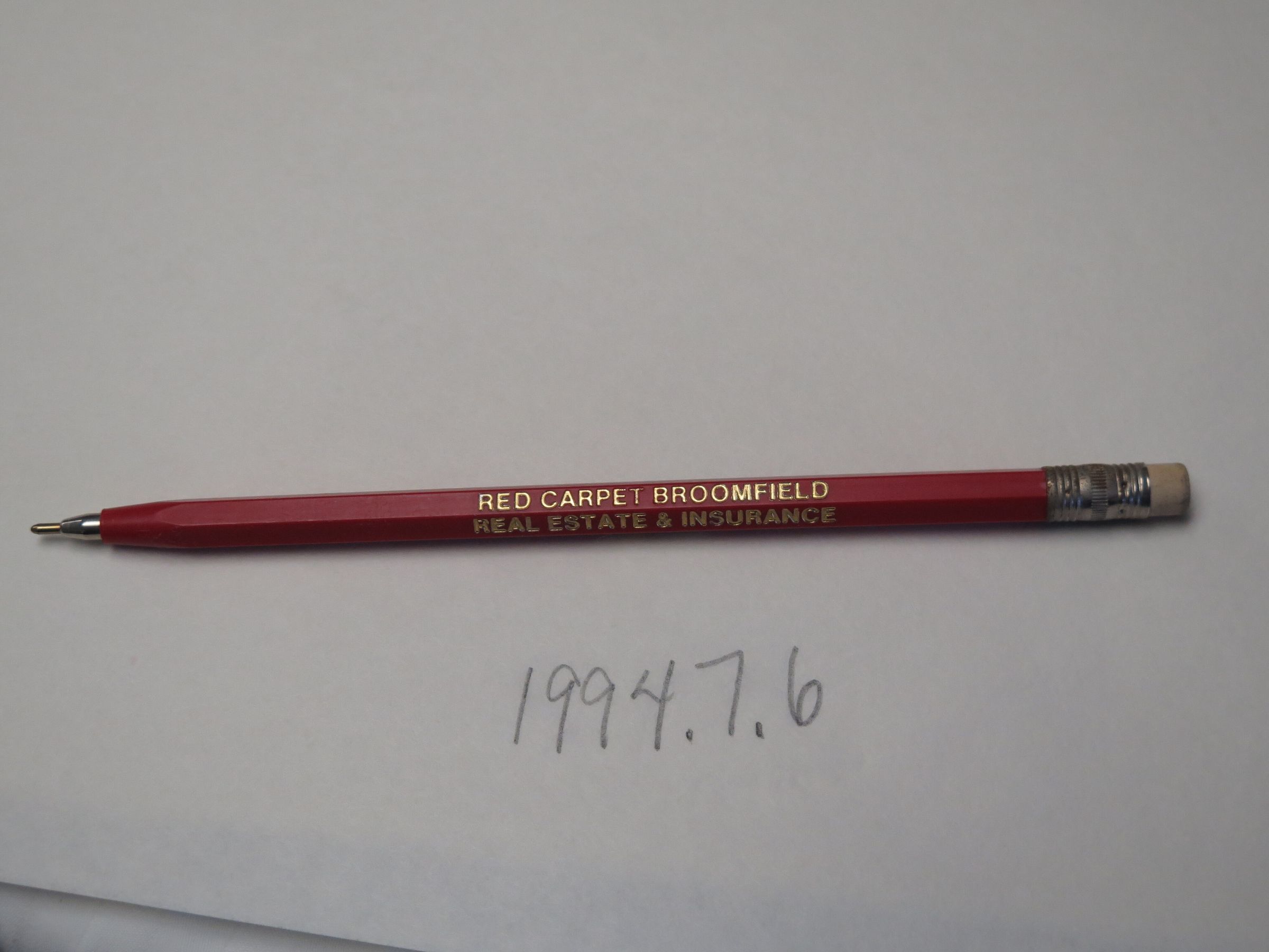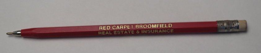The red 6.5" (l) ballpoint pen is marked "Red Carpet Broomfield Real Estate and Insurance". It is made to look like a pencil, with an eraser on the end.