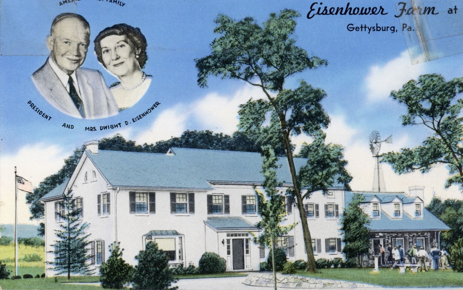 Item is an illustrated postcard featuring Eisenhower Farm in Gettysburg, Pennsylvania, one of Dwight and Mamie Eisenhower's favorite spots to spend time at. The postcard states that a few hundred yards away was the location where President Eisenhower was first commissioned as Major during World War I, which would launch his military career, eventually leading him to command the D-Day Invasion of Normandy Beach in France during World War II. The image is colored with blue, white, and green, and a picture of Dwight and Mamie is visible in the top left corner. The building is now part of the Eisenhower National Historic Site.Photograph Details