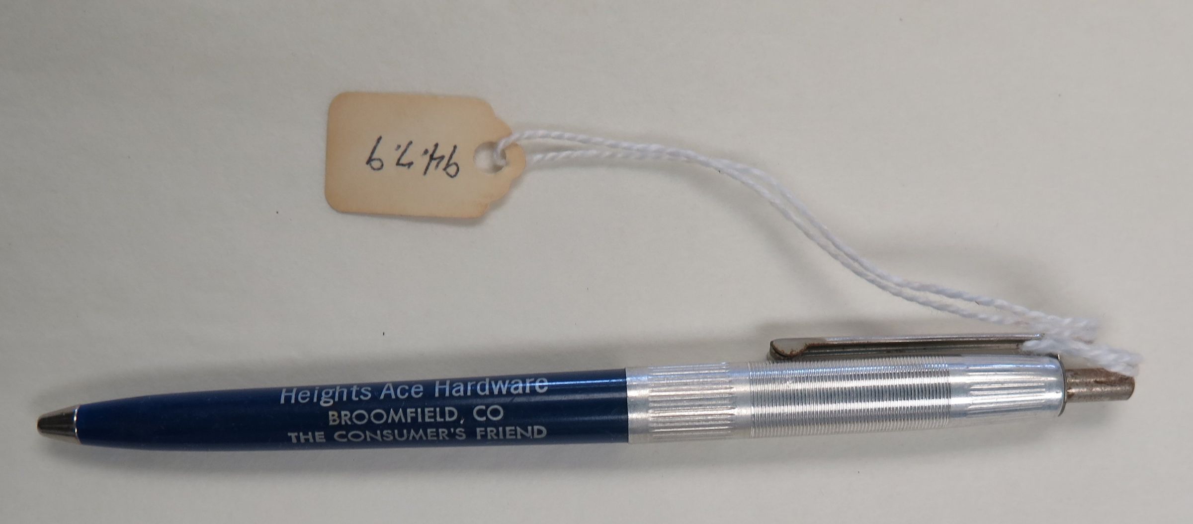This is a ballpoint with a dark blue plastic lower tube and a metal upper tube and clip. The pen has white text on the blue lower tube that reads, "Heights Ace Hardware/ Broomfield, CO/ The Consumer's Friend". The pen measures 6" (l).