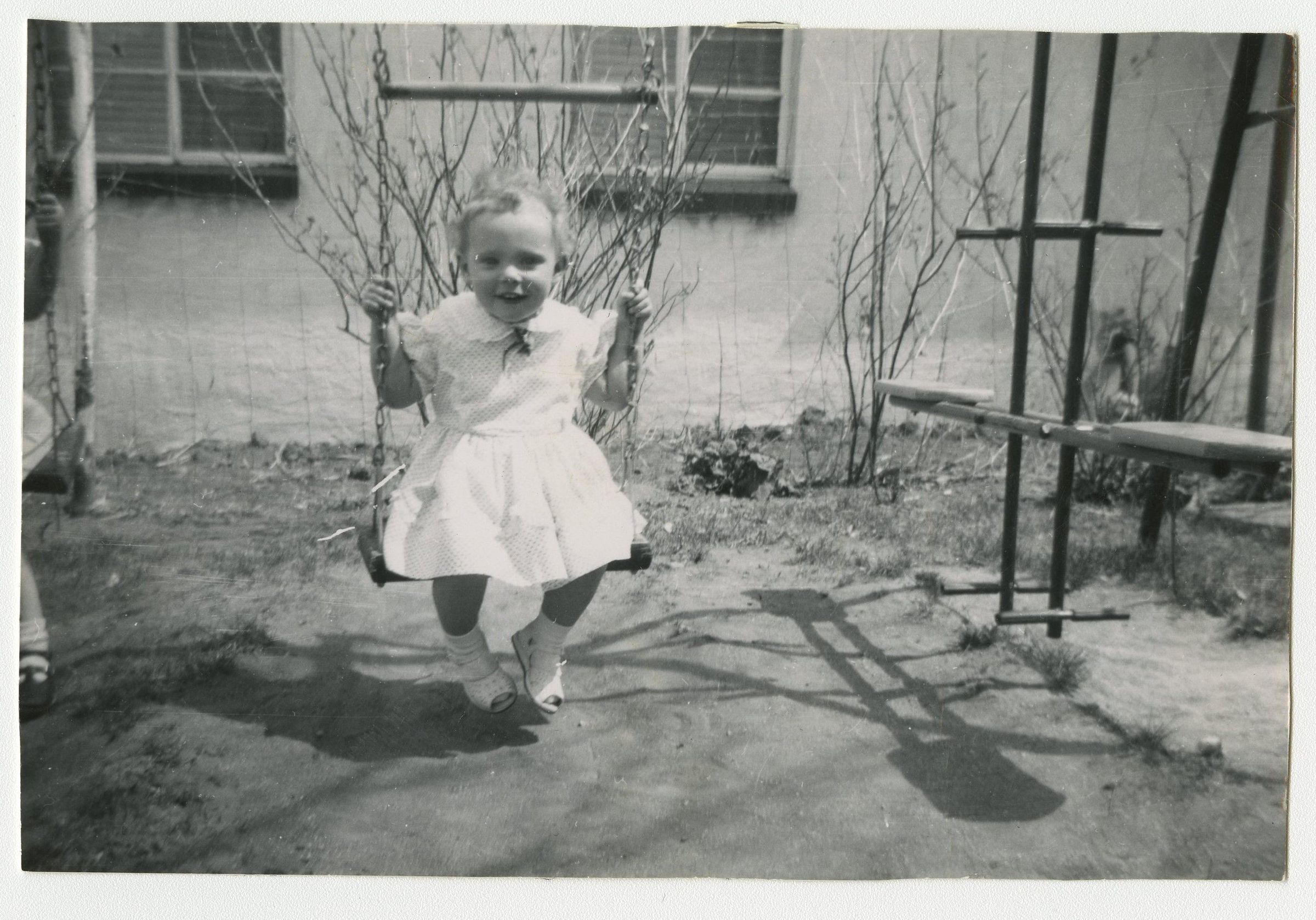 Black and white photograph of a girl on a swing.
