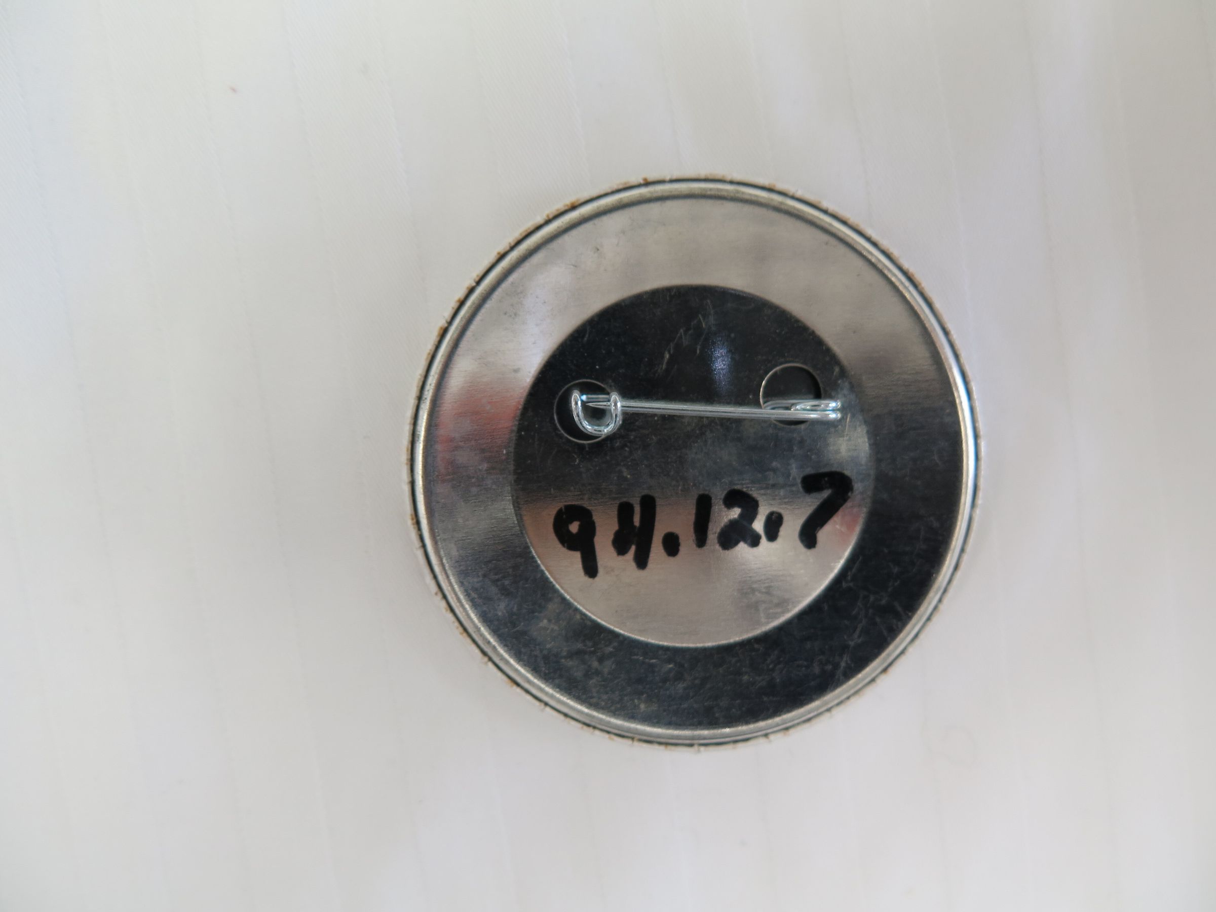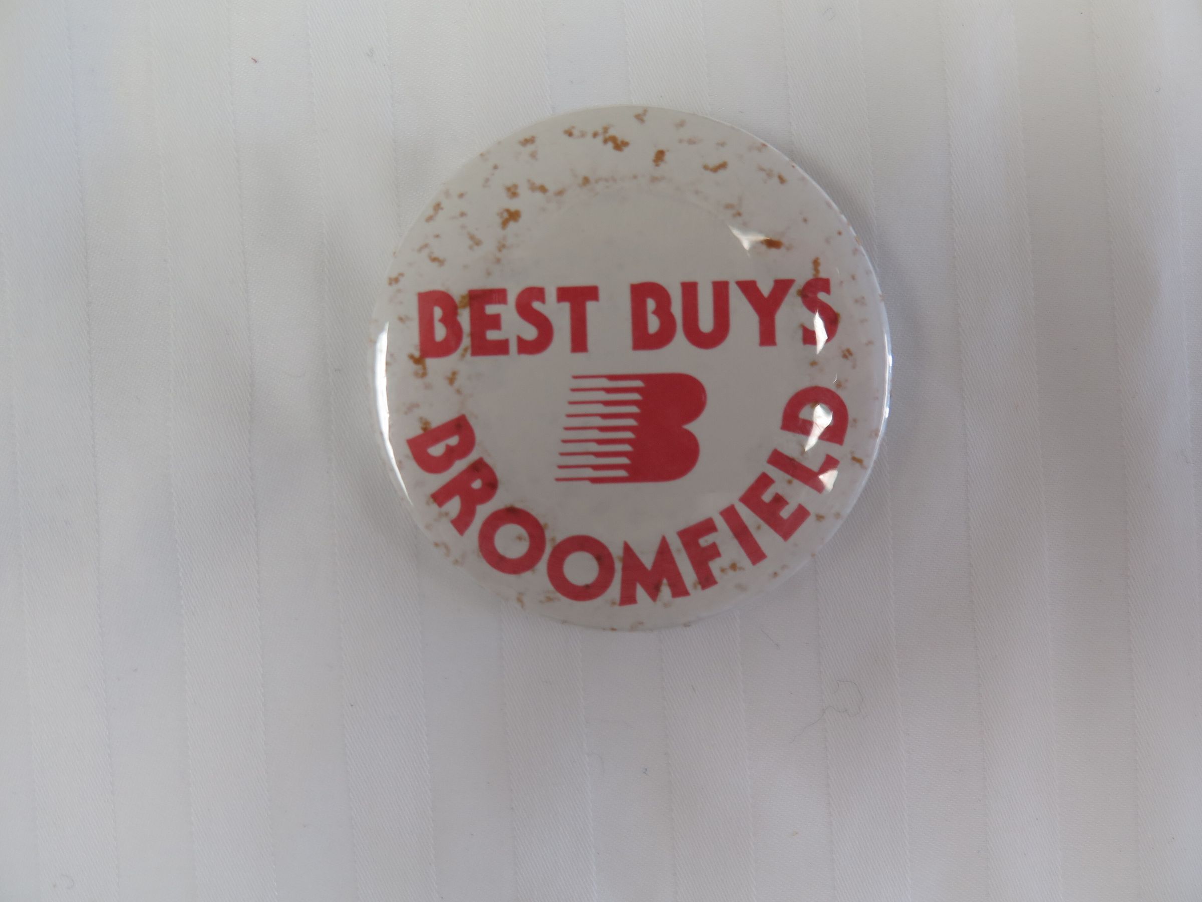 This is a round button with a pin closure on the back. The button has text in red font on the front that reads, "Best Buys/ Broomfield". The button measures 2.25" (dia).Collection