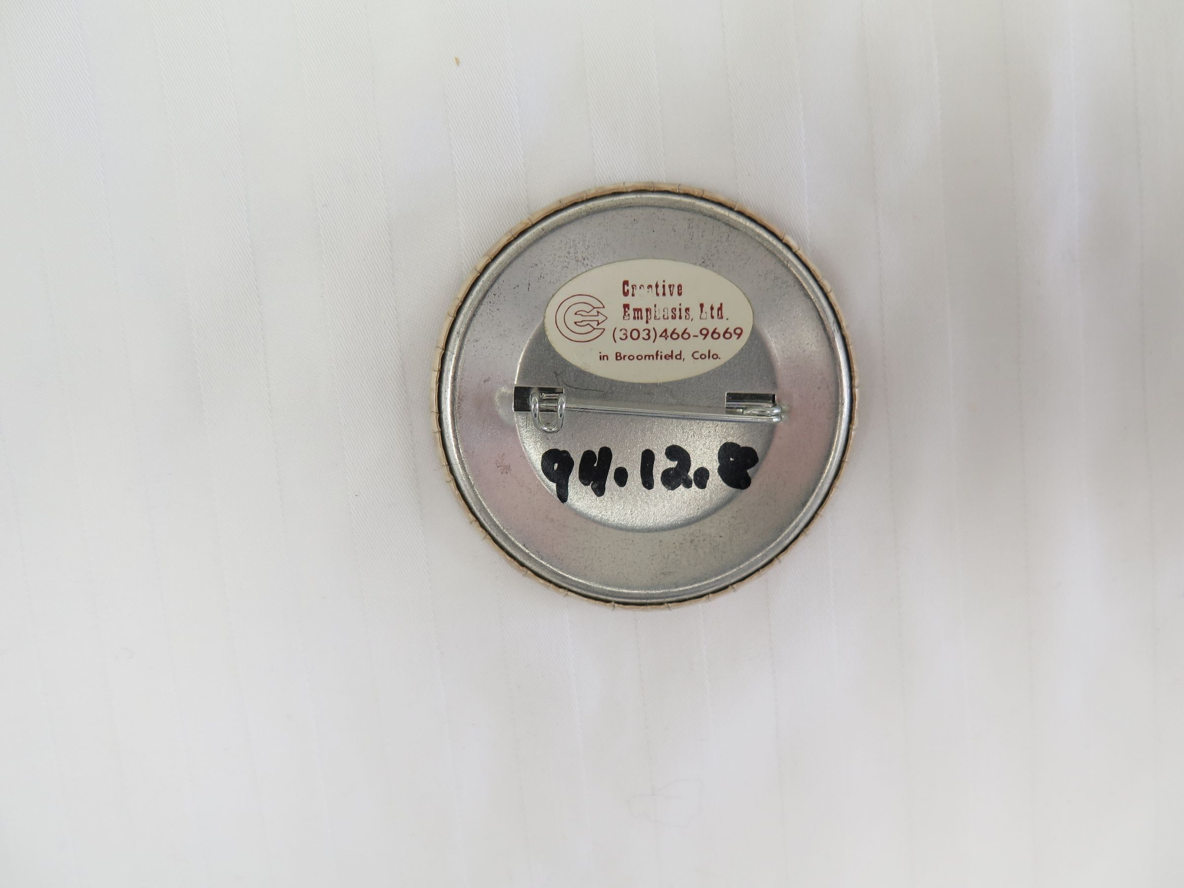 This is a round button with a pin closure on the back. The button is brown and cream with the image of an airplane and the text "Jeffco Airport" on the front. The button measures 2.25" (dia).Collection