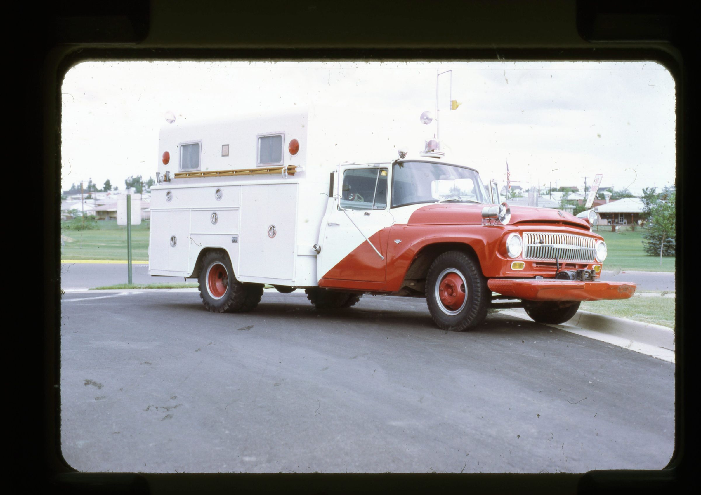 A color transparency depicting the side of a white and red firetruck parked on the side of a street. The truck in the image is a 1965 International.
