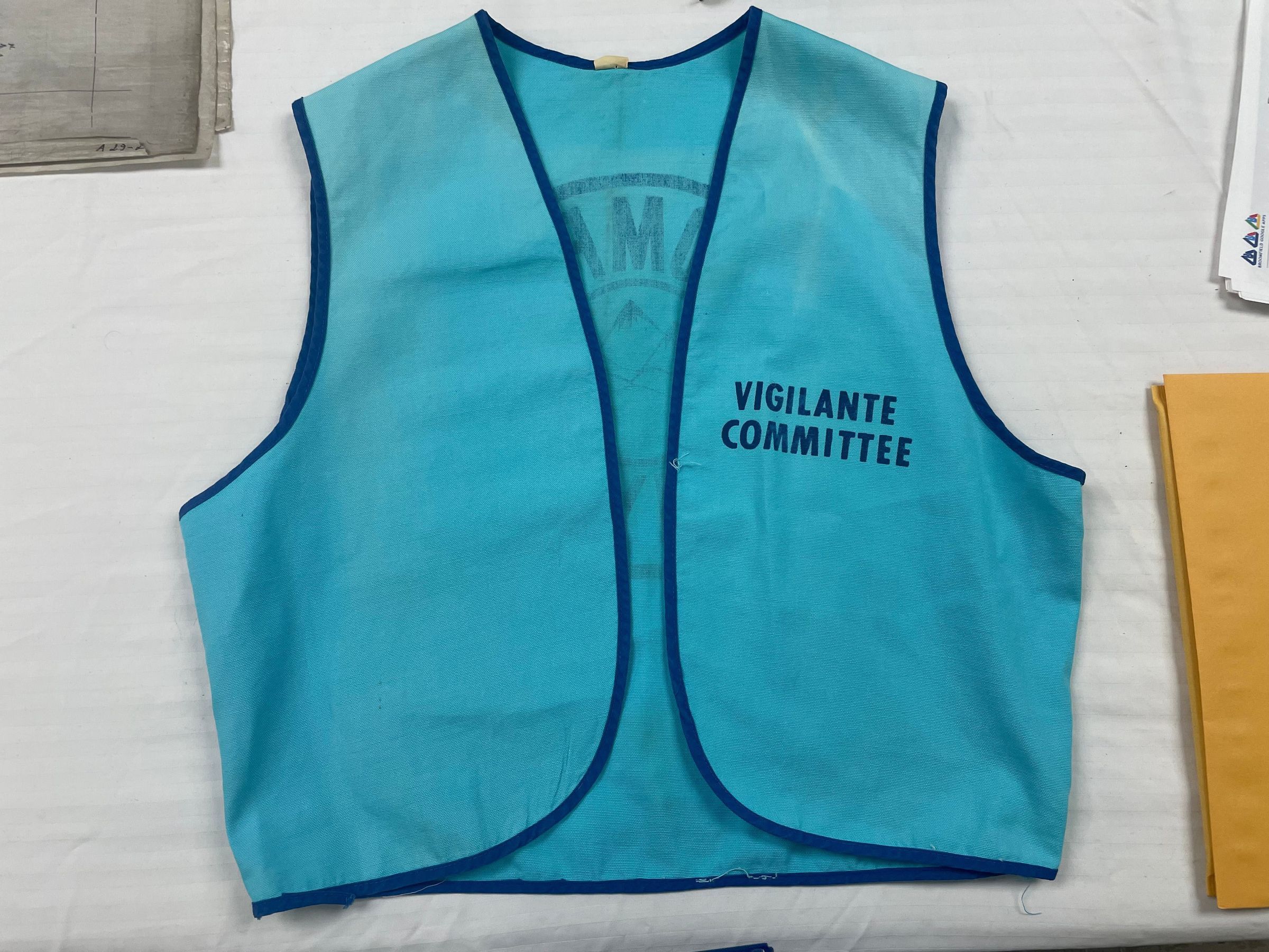 A teal blue Broomfield Days vest that is edged in dark blue cloth. On the right side of the front of the vest are the words 'Vigilante Committee' printed on, in blue. On the back of the vest is the Broomfield Days logo. The logo consists of two circles, one inside the other. In the inner circle are three mountain peaks. Outside of the inner circle are the words 'Broomfield Days.' The logo is printed with the same blue color as the 'Vigilante Committee' on the front of the vest.Collection