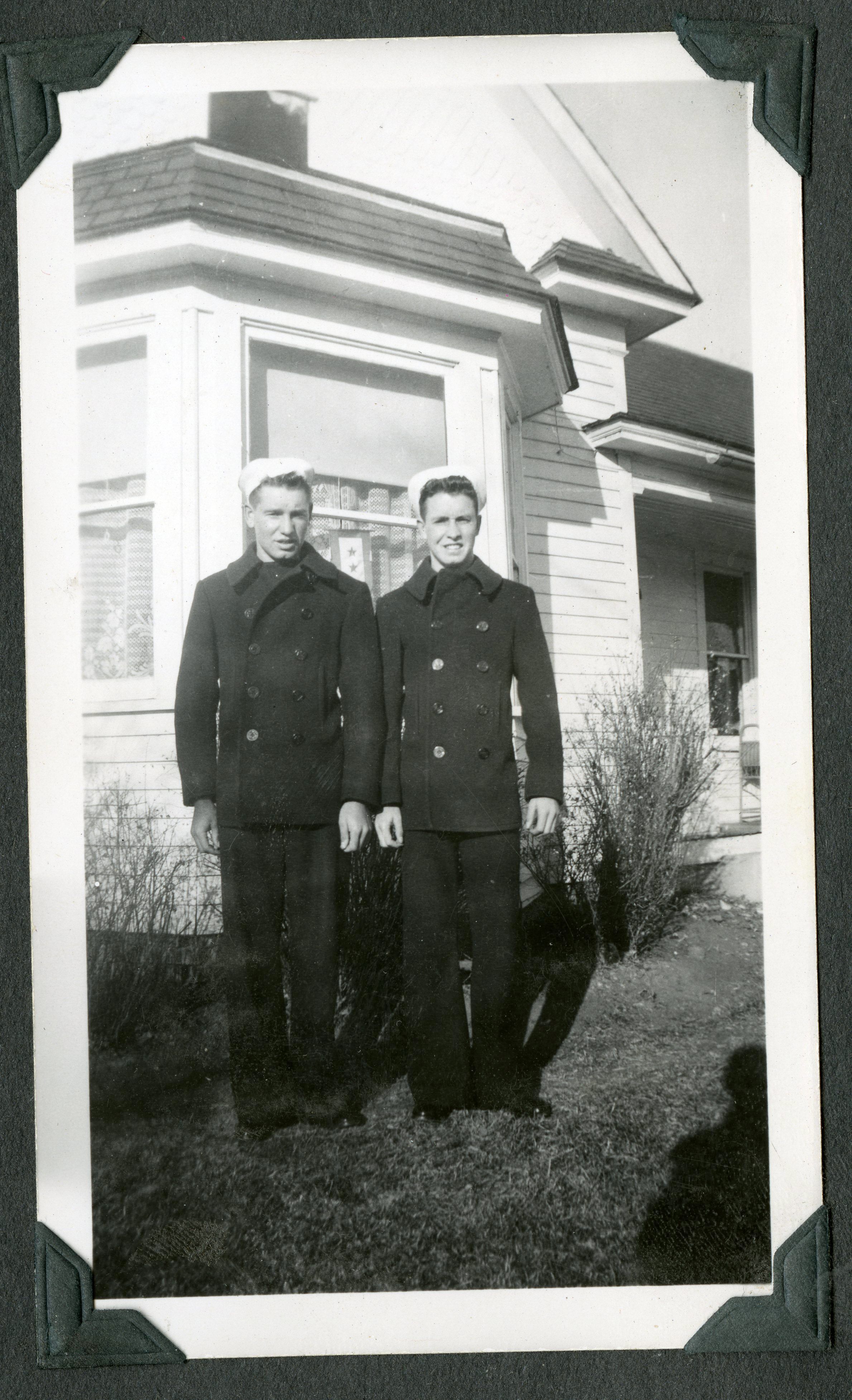 Black and white photograph of two young men, probably Clyde and Gib Brunner. Photograph probably taken at the Brunner Farmhouse.