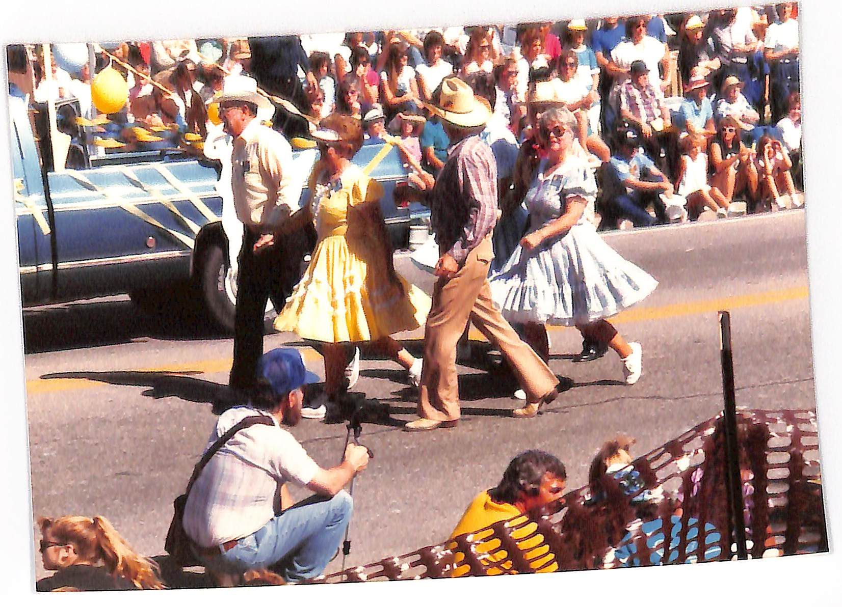 Item is a photograph printed on Kodak paper taken during the 1989 Broomfield Days event. In the photo, four pairs who had previously been dancing in the parade are walking down the street, waving at the crowds that have gathered on both sides. Next to them, the back end of a blue pickup truck is visible, looking as if it's been decorated with balloons and streamers. The women in the street are wearing dresses, and the men are wearing cowboy hats and button-down shirts.Photograph Details