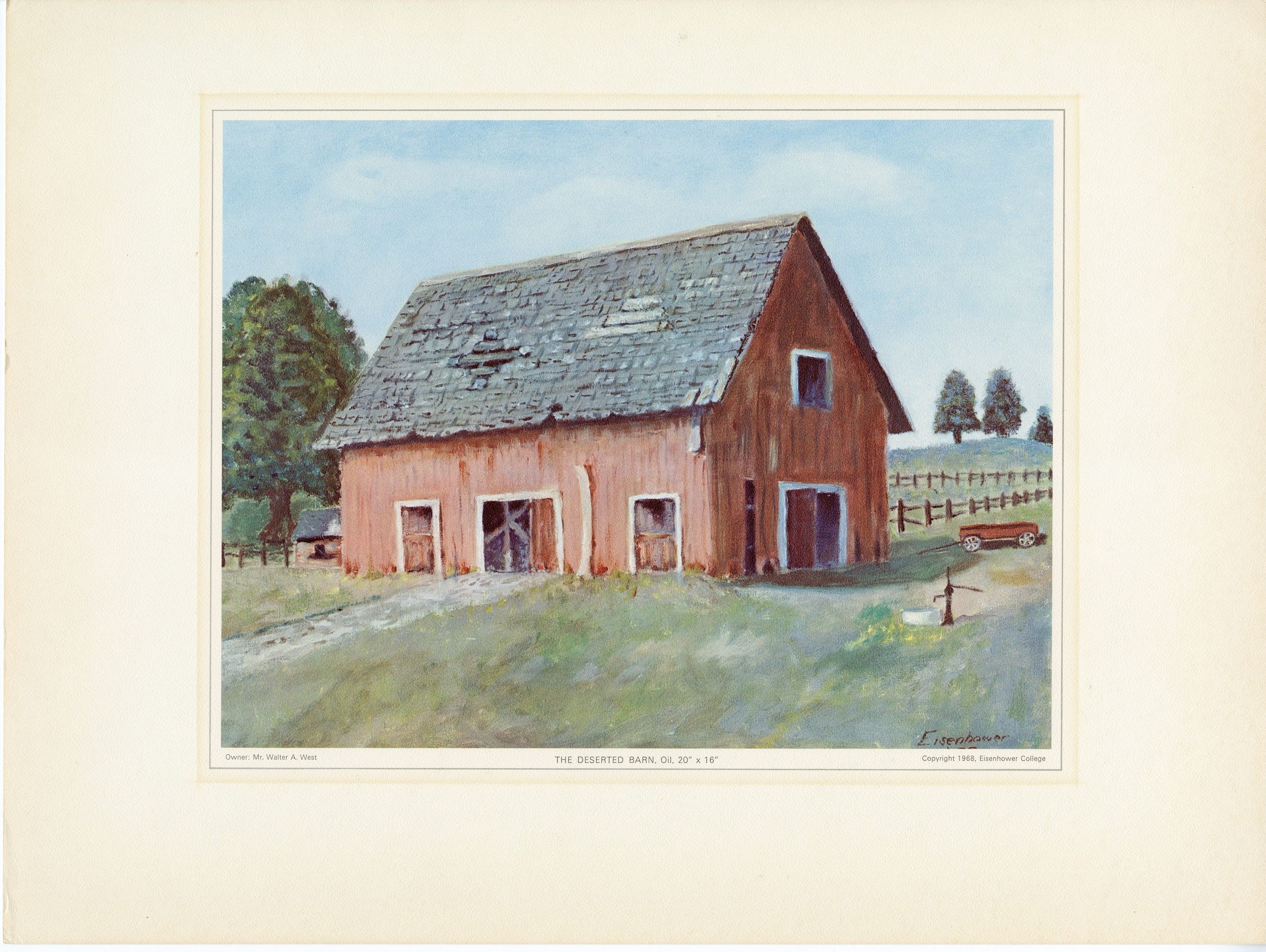A print of an oil painting by Dwight D. Eisenhower, titled "The Deserted Barn". The original painting's dimensions are 20" x 16". Underneath the image, it states that the owner of the painting is Walter A. West. Depicted is a red barn as the subject in the foreground, being worn down as seen in the damaged roof, curling planks, and faded paint. Outside of the barn is a red wagon, fencing, a tree, a small outbuilding (coop?) and water pump. In the background, there are hills with trees. The barn itself sits upon cool toned grass. The artist's signature is seen below in the bottom right corner.Artwork Details
