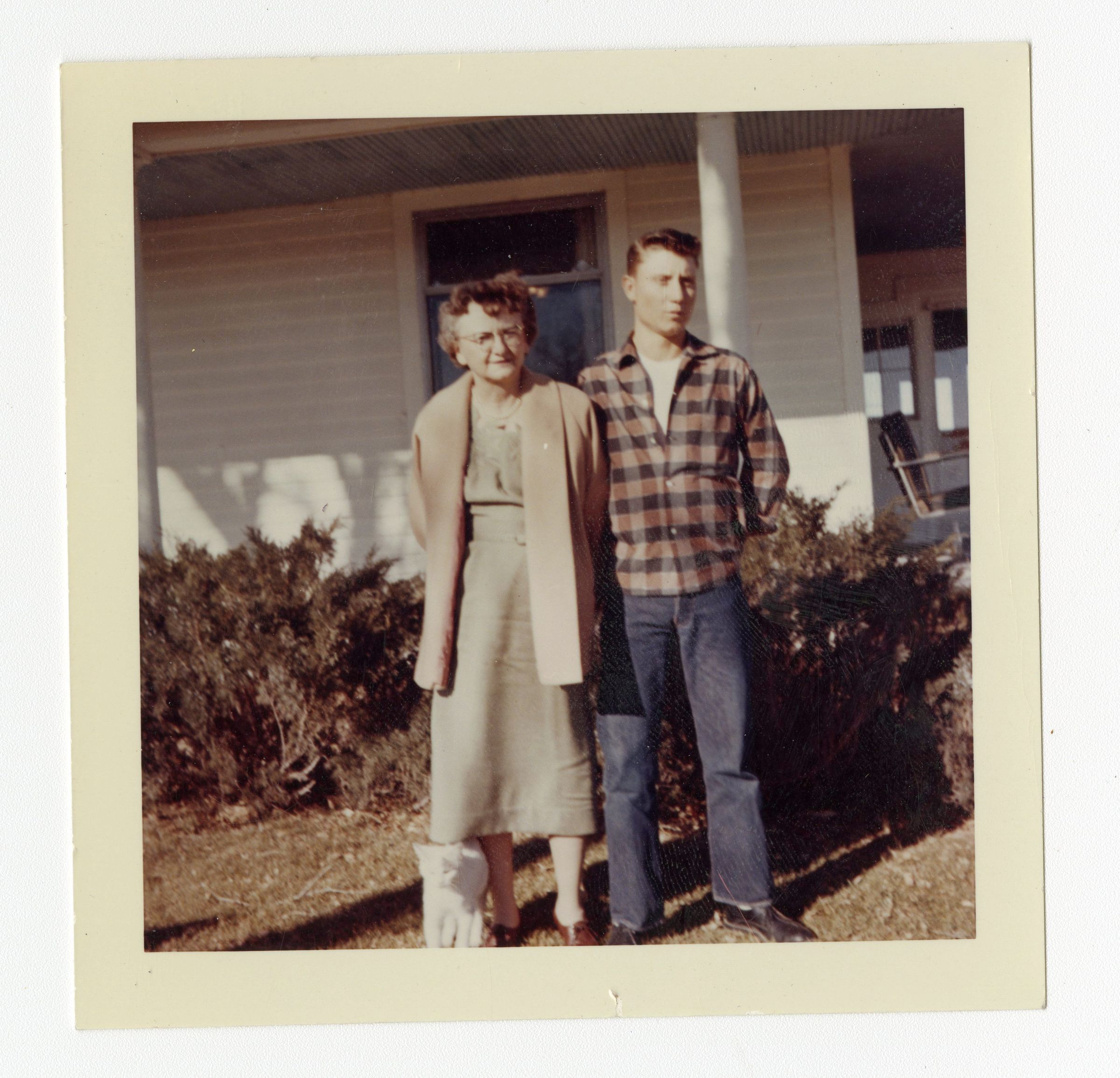 Color photograph of two people, a man and a woman, standing near the porch of a house. The woman is wearing a long beige dress, a tan jacket, and glasses. The man is wearing jeans and a plaid shirt. The woman is identified as Aunt Pat (Margaret Shaw) and the man is identified as Lester K Brunner.Photograph Details