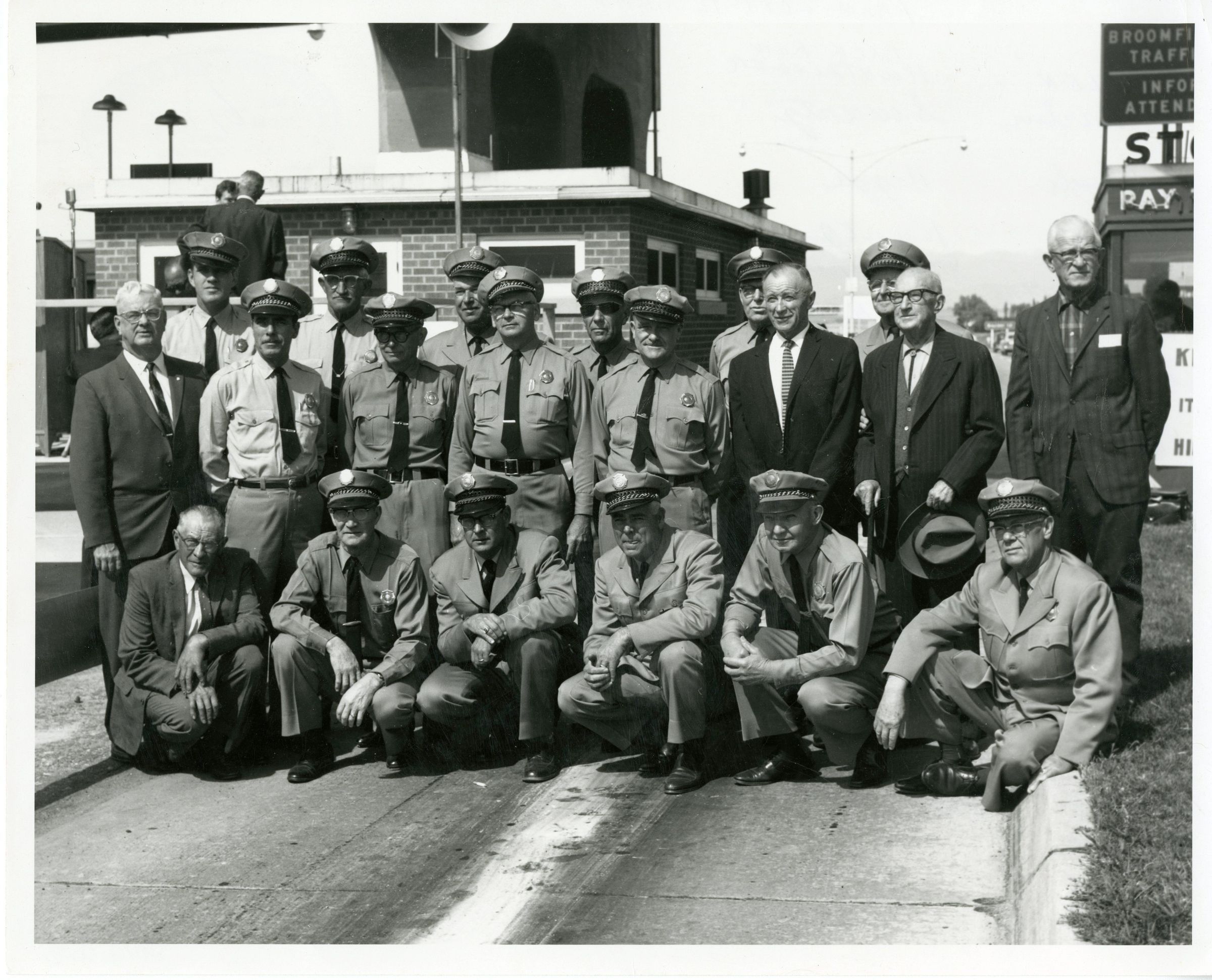 The picture depicts the toll booth workers in 1950s. There are 20 men in from of the tollbooth, looking west. Most everyone in the picture is wearing their tollbooth uniforms, but the two on the farthest left, and the rightmost three in the second row, are all wearing suits. They are all standing in the road, and while the back two rows are all standing, the front row is squatting on the road. In the background there are a couple of signs that are cutoff in the picture, and there is a grain silo in the background. As well there are two men talking behind the tollbooth men.