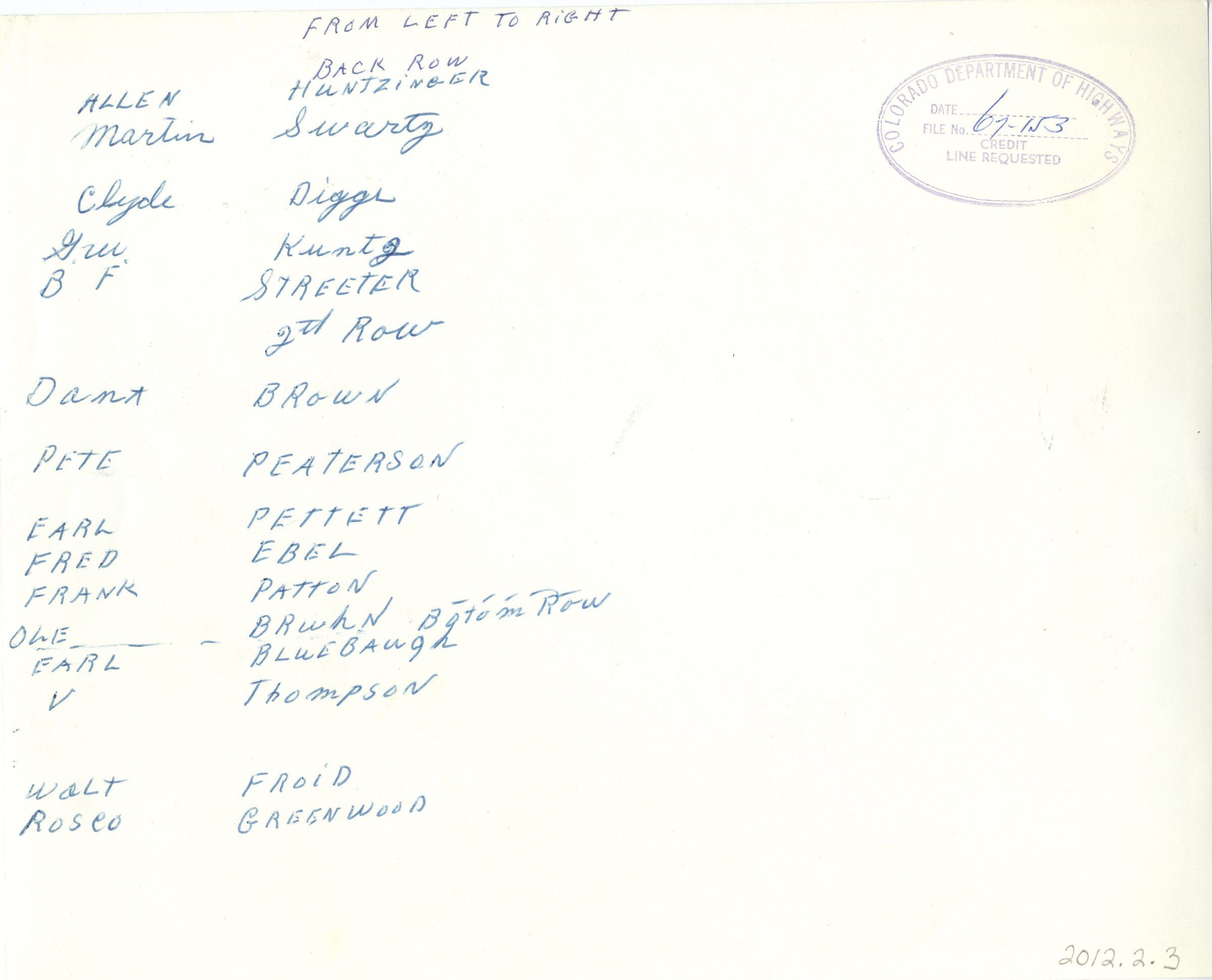 The 2nd row are: Dan Brown, Pete Paterson, Earl Pettett, Fred Ebel, Frank Patton.