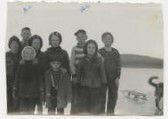 Black and white photograph of a group of children wearing warm clothing. On the right side of the image, a sled and part of a dog can be seen. Photograph was taken outside in the winter. Two of the children are identified as Gib and Dale. Gib is second to the left in the back of the group. Dale is standing third to the right.