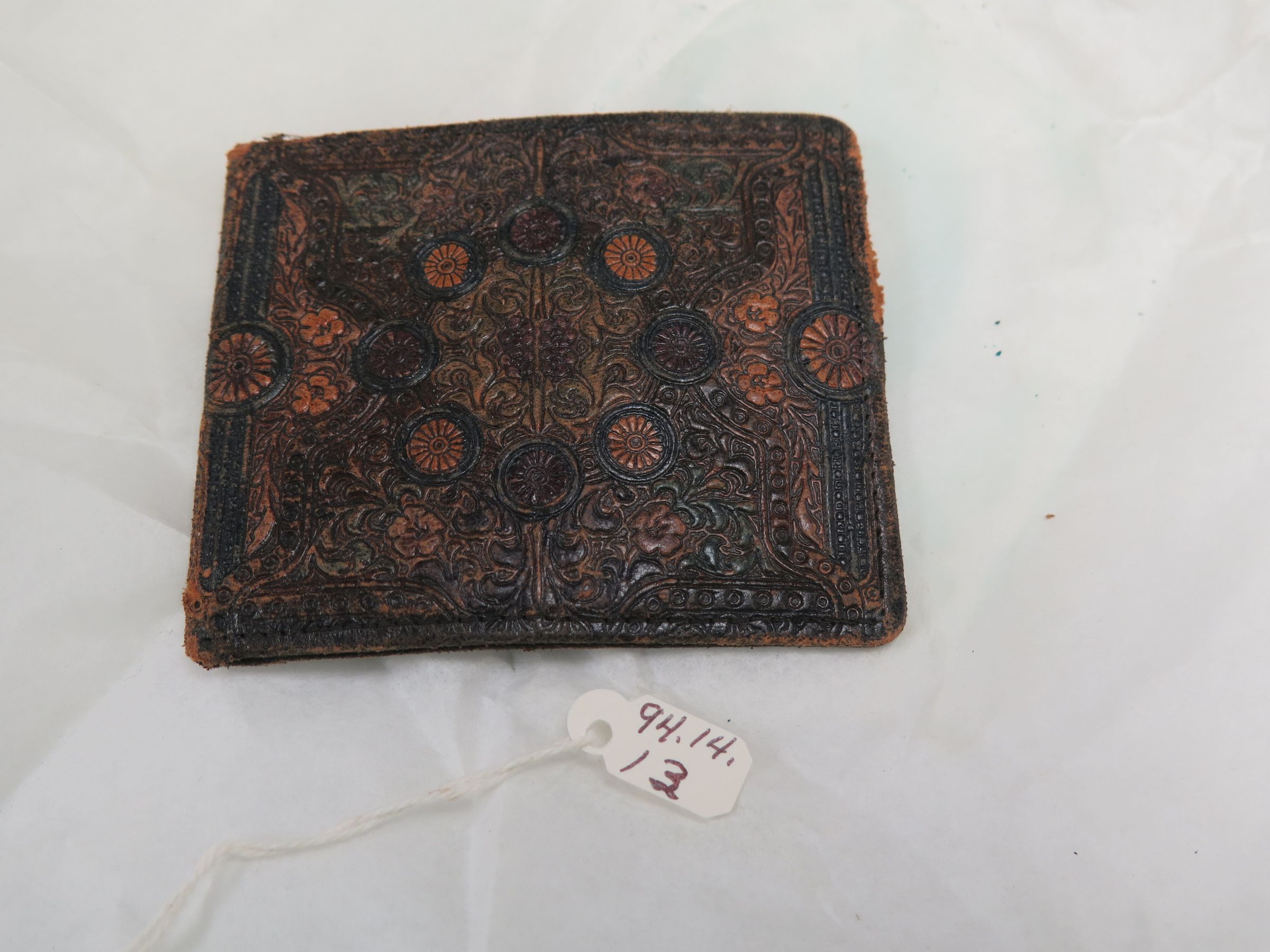 This is a brown leather wallet with an intricate design stamped onto it. The wallet measures 3.5" (w) x 3" (l).