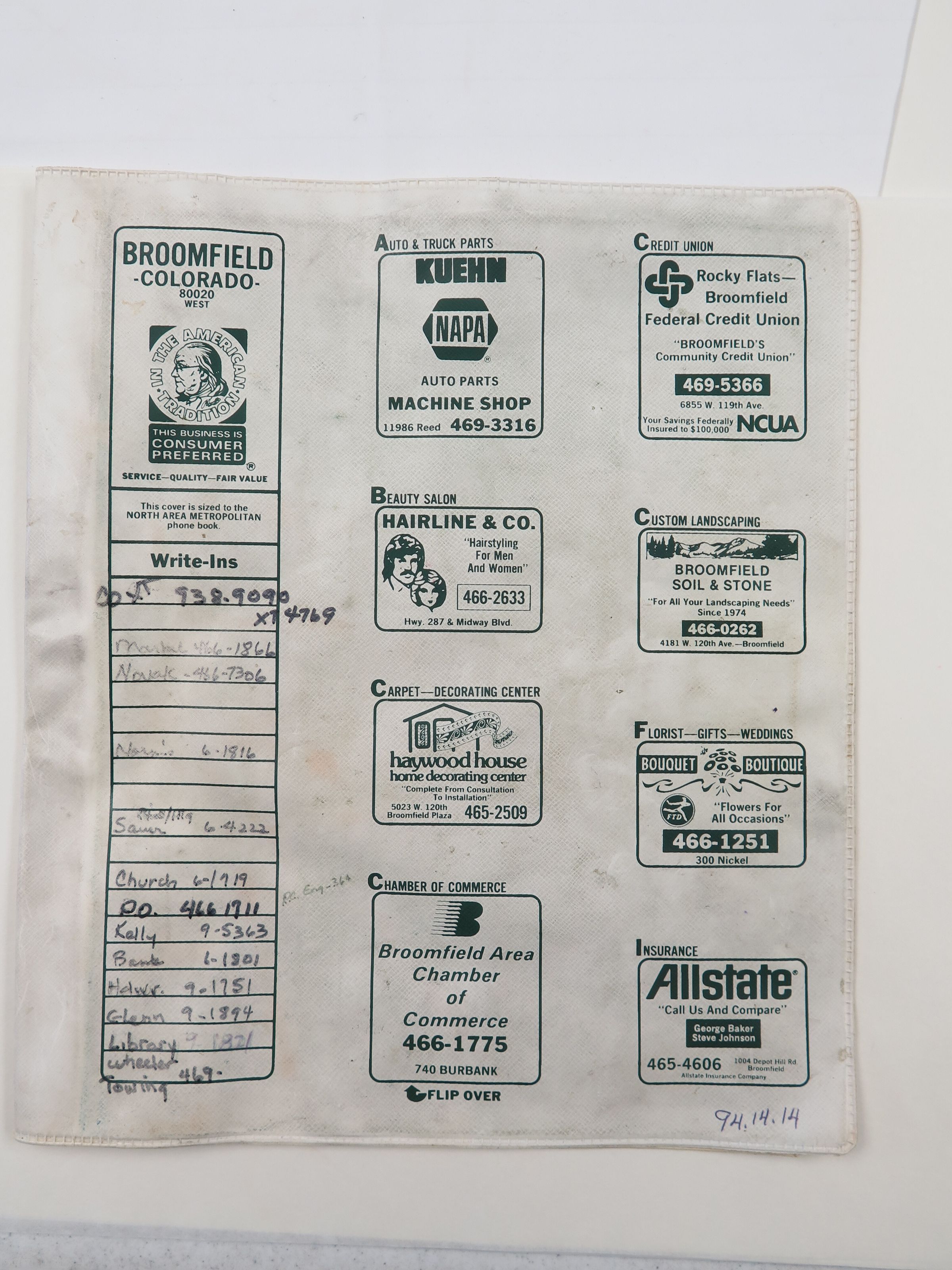 This is a plastic cover for a telephone book from 1989. The cover features ads from Broomfield businesses and includes write-in numbers that were not included in the book. The cover measures 11" (h) x 9.5" (w).Collection