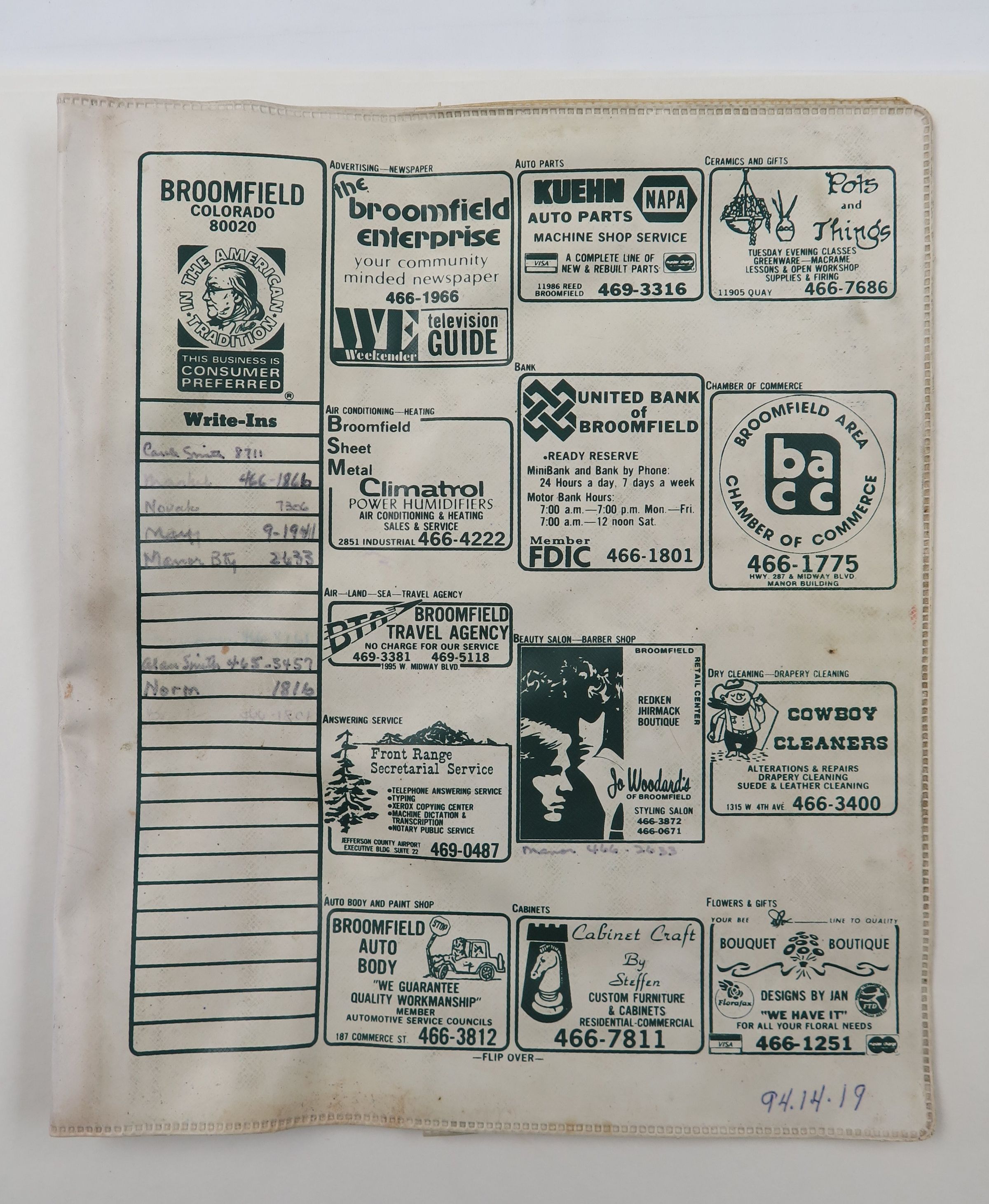 This is a plastic telephone book cover. The cover features ads for various Broomfield businesses. The cover measures 11" (h) x 9.5" (w).Collection