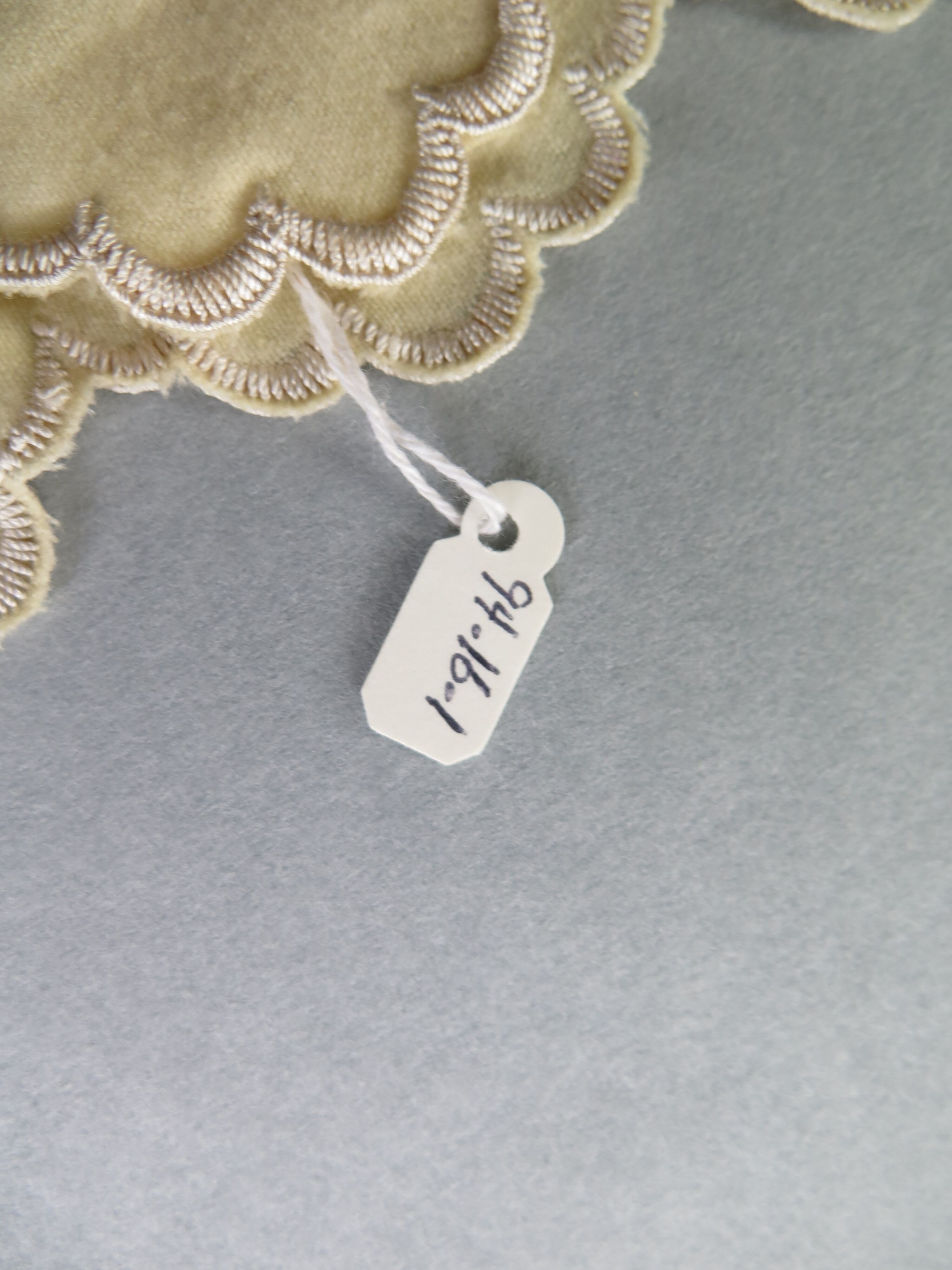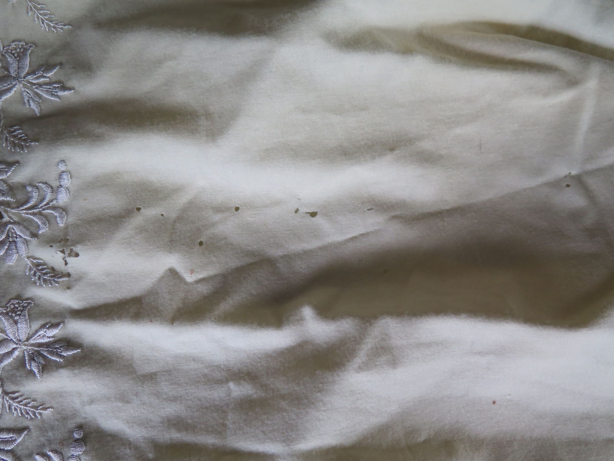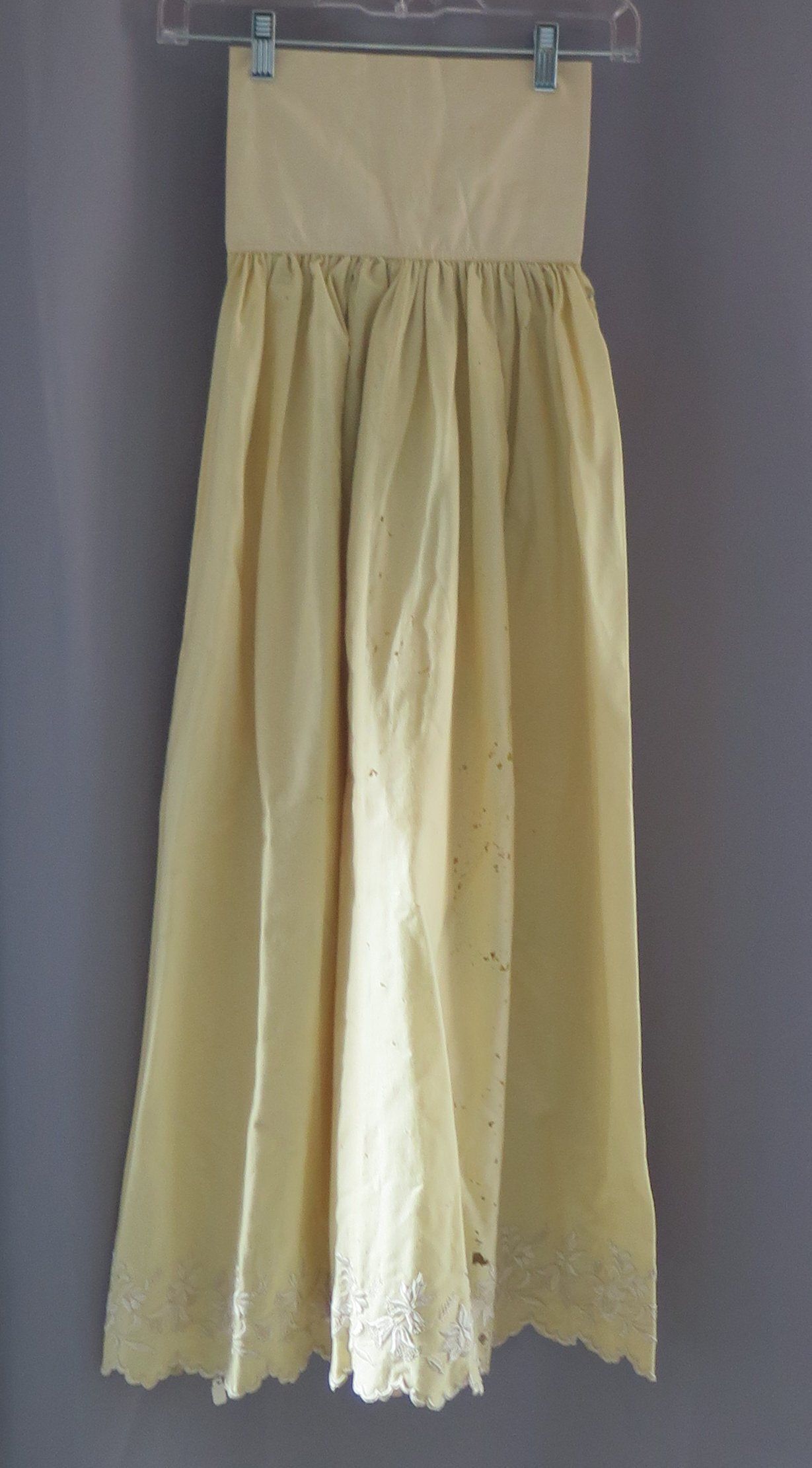 Off white women's wool petticoat. There are pleats under the waistline of the petticoat. The bottom of the petticoat is scalloped with a floral embroidered trim. The petticoat measures 30" (w) x 36.5" (l).