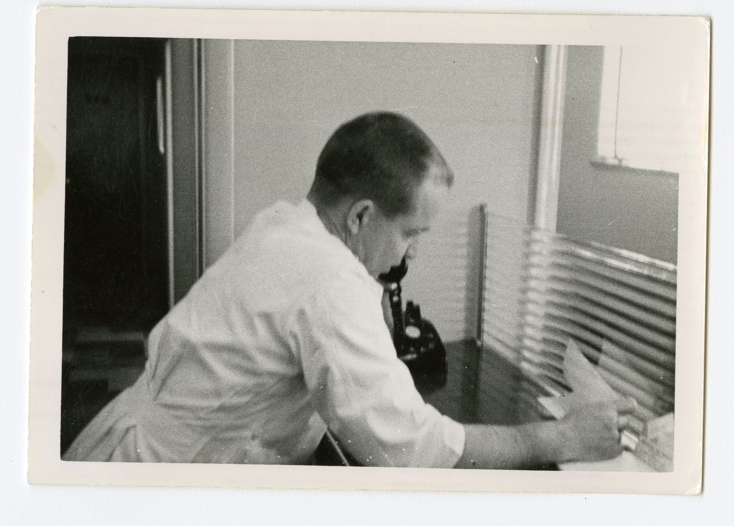 Black and white photograph of Clyde Brunner at the vet office. Probably after obtaining his degree in veterinary medicine in 1951.
