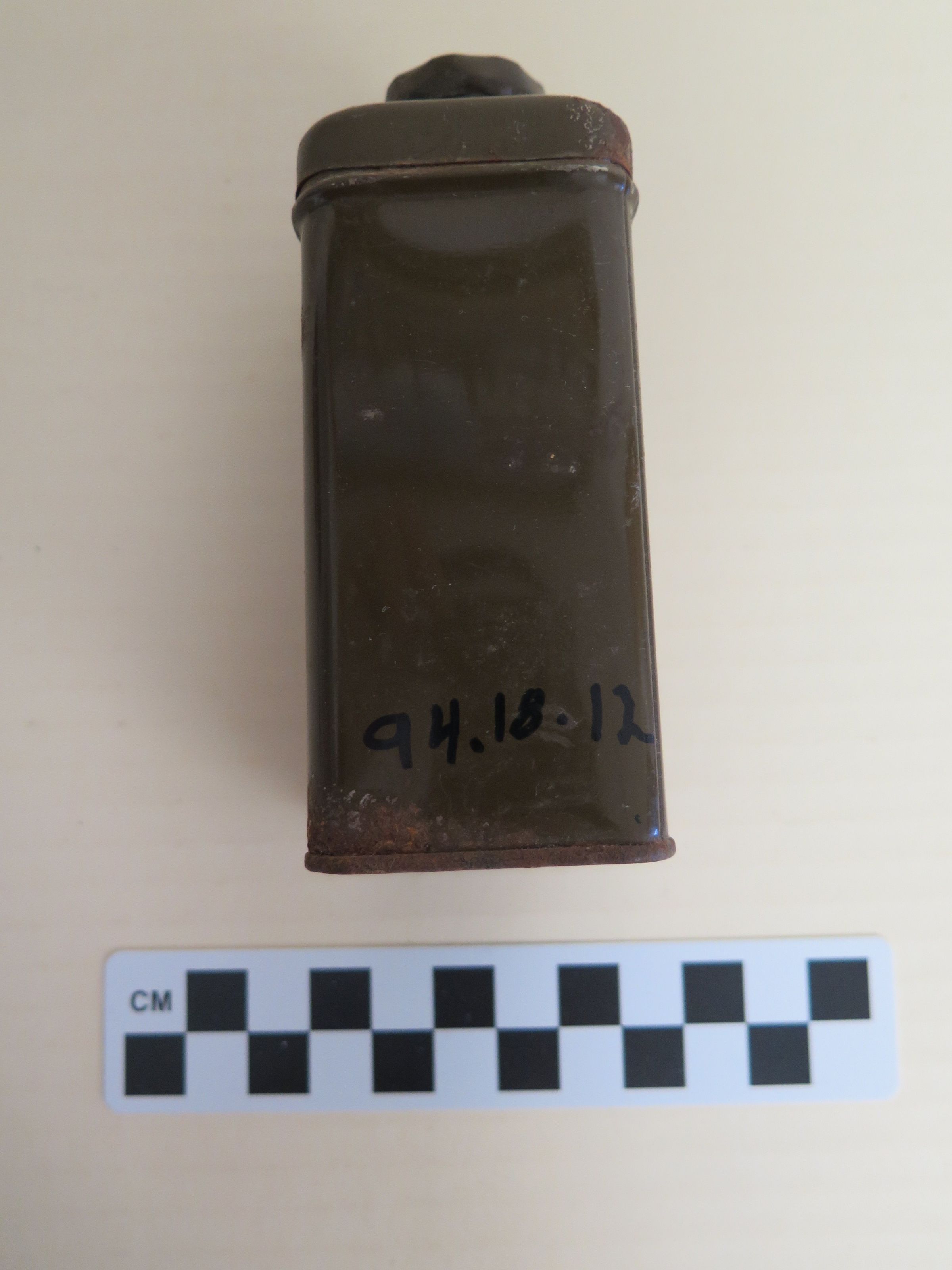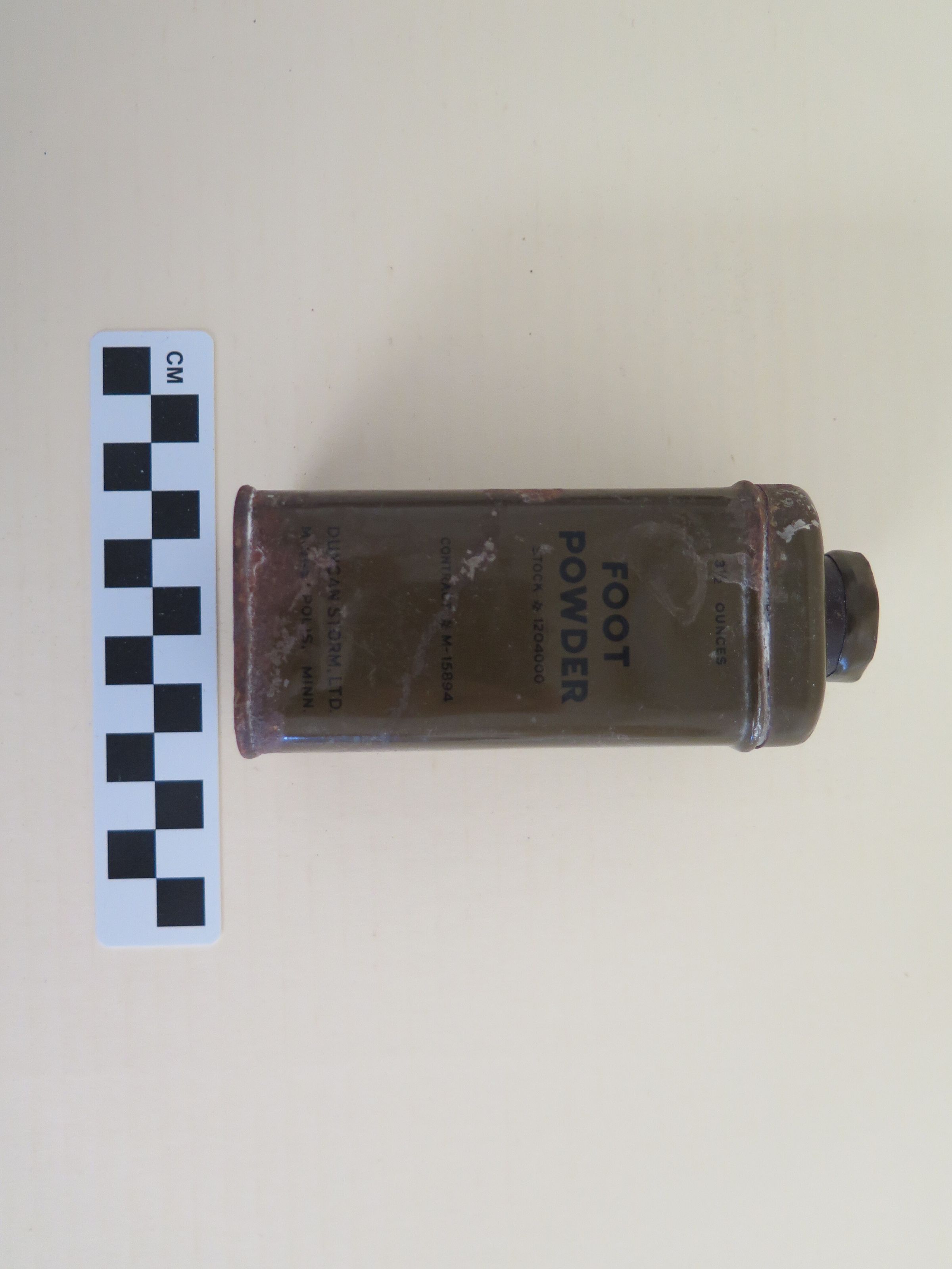This is a dark metal tin of Foot Powder used by the Army in WWII. The tin measures 5" (h) x 1.75" (w) x 1.75" (l).Collection