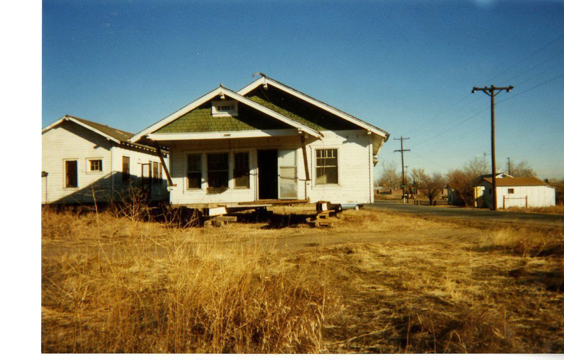 Photograph of the Crawford House. Building is in the process of being moved. 1996. Powerlines on the right side next to a street. Original