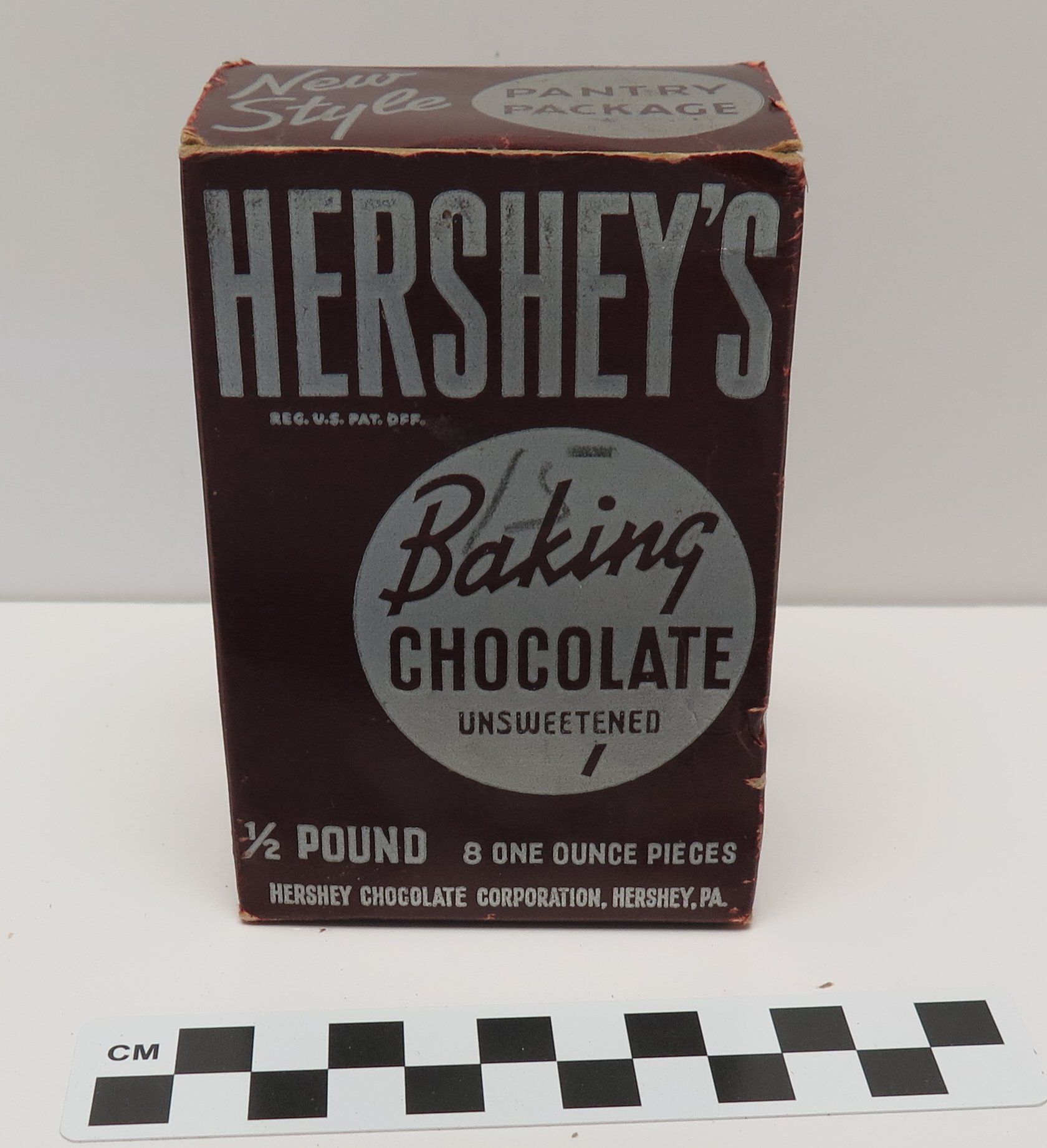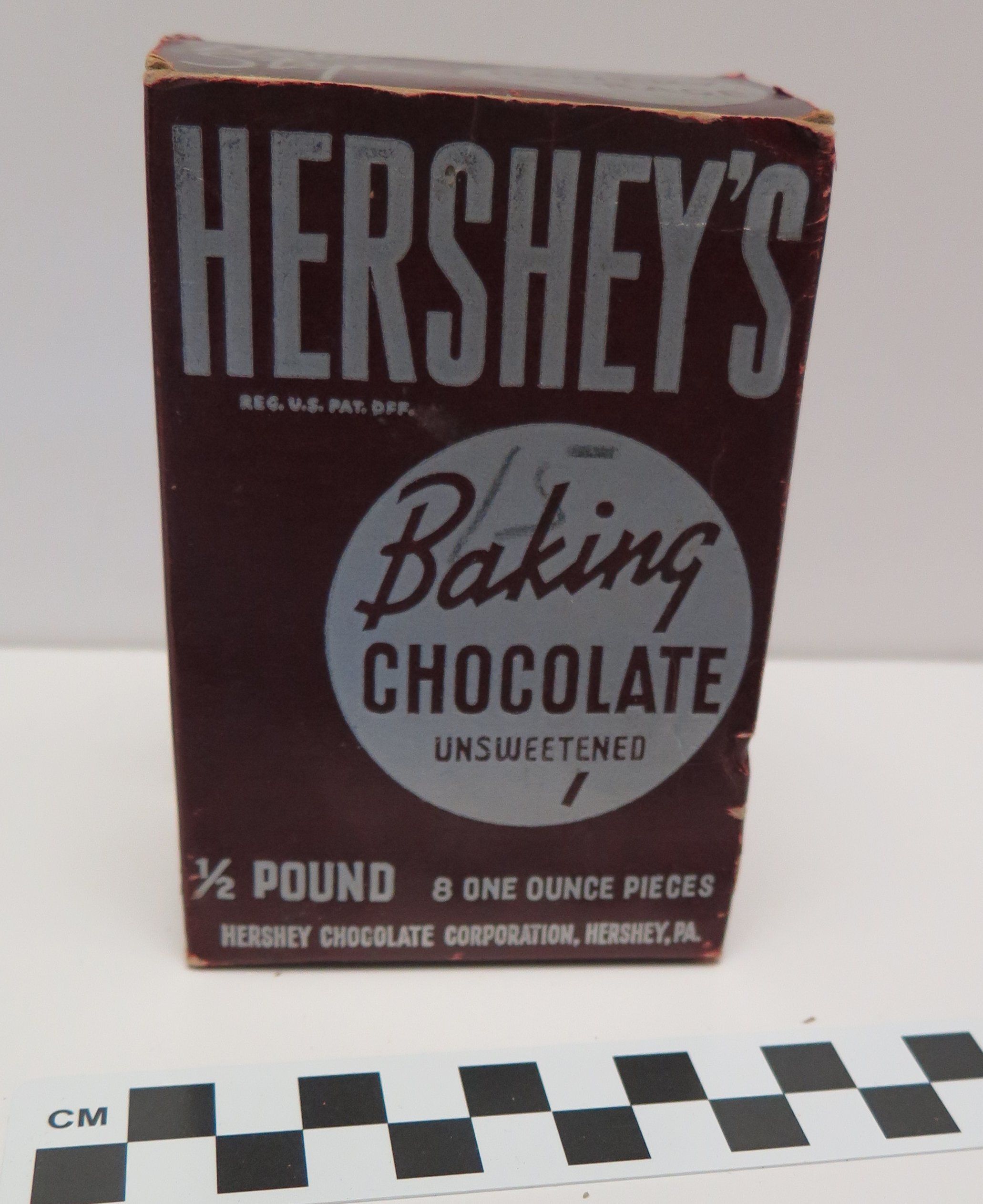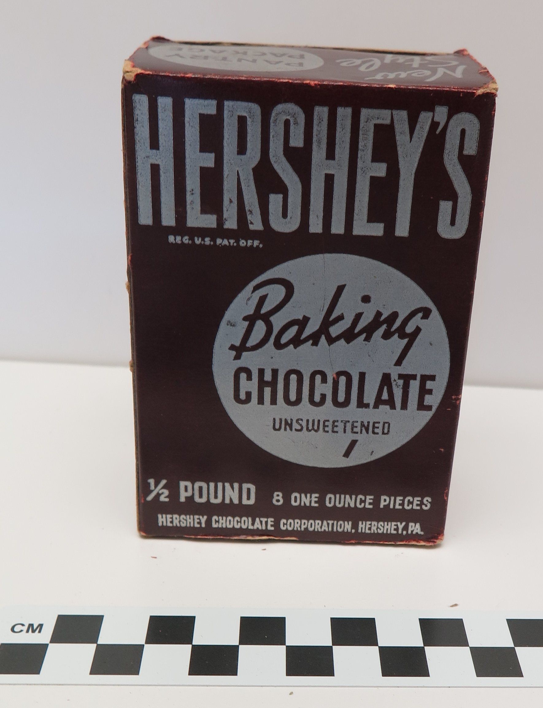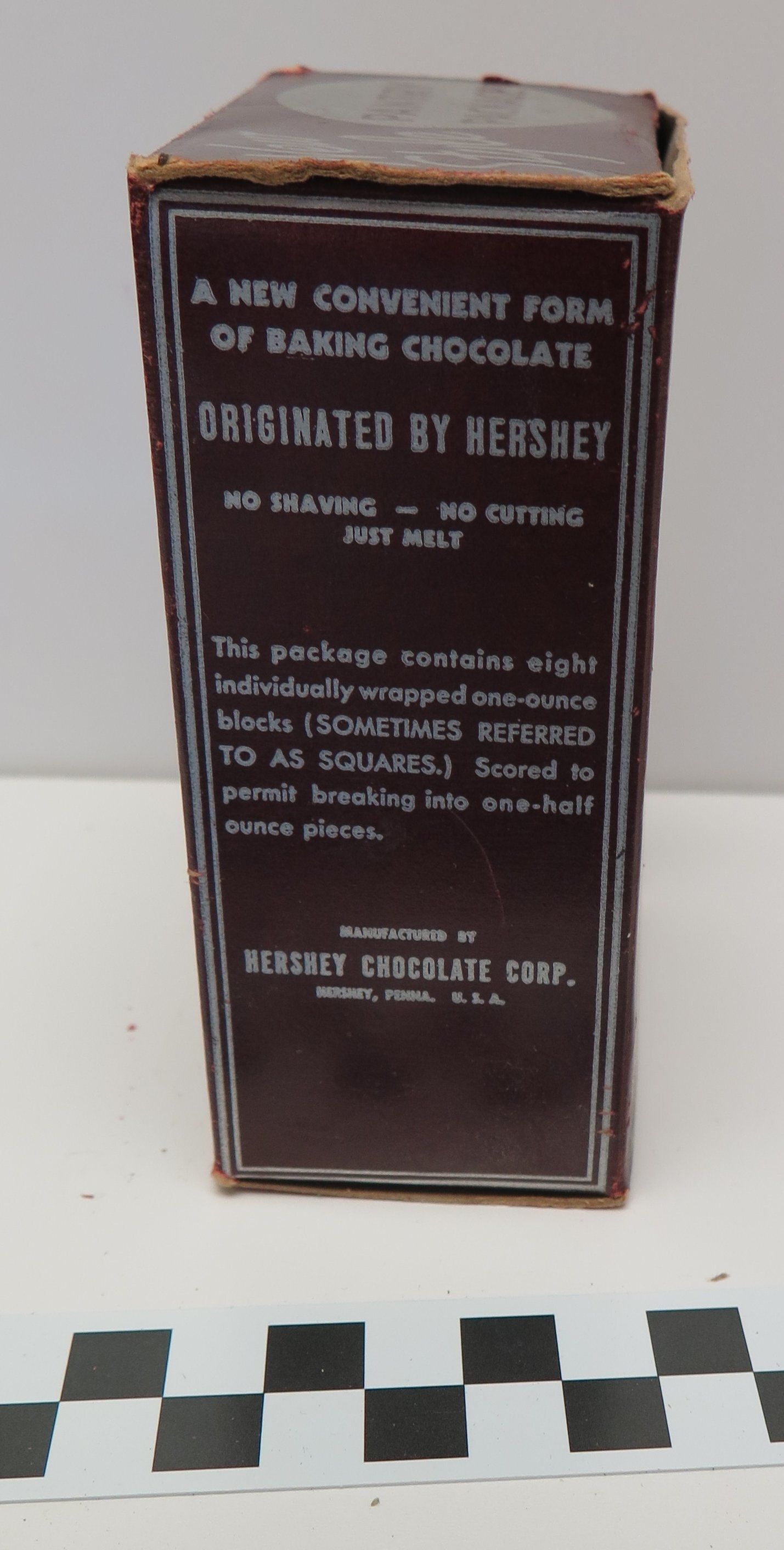 This is a paperboard box that contained Hershey's Baking Chocolate (As noted on the front and back sides of the box in silver and brown lettering). The box is brown in color with a silver circle accent with silver and brown lettering.4.25"(H) x 2.875"(W) x 1.875"(D)Collection