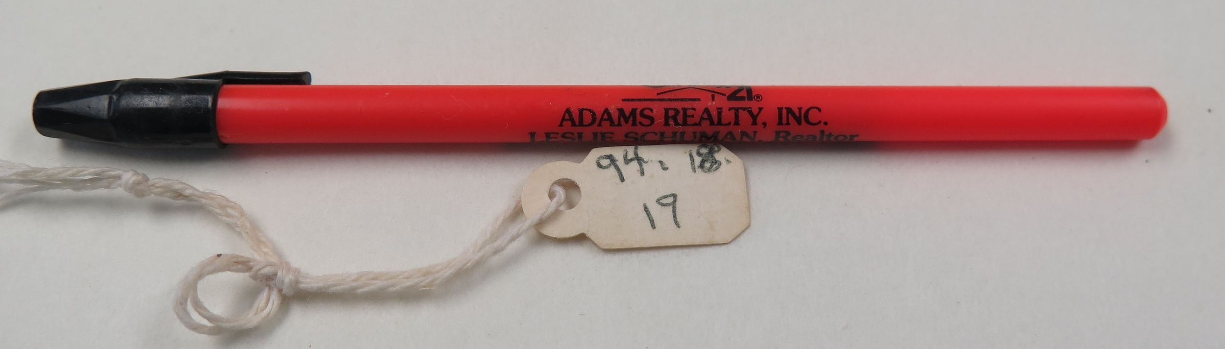 This is a red ballpoint pen with a plastic barrel and a black plastic cap. The pen was distributed as an advertisement for Century 21 Realty. The side of the pen has black text that reads, "Adam's Realty, Inc./ Leslie Schuman, Realtor".