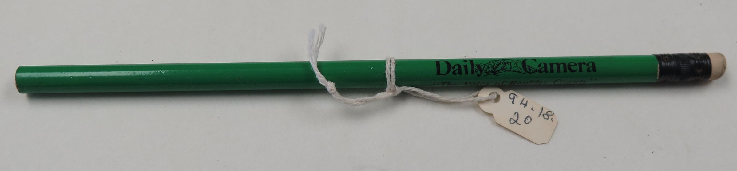 This is an unsharpened wooden pencil that has been painted green. The pencil has a black metal ferrule and a white eraser. The side of the pencil has black text that reads, "Daily Camera/ 'The Voice of Boulder County'". The pencil measures 7.5" (l).Collection
