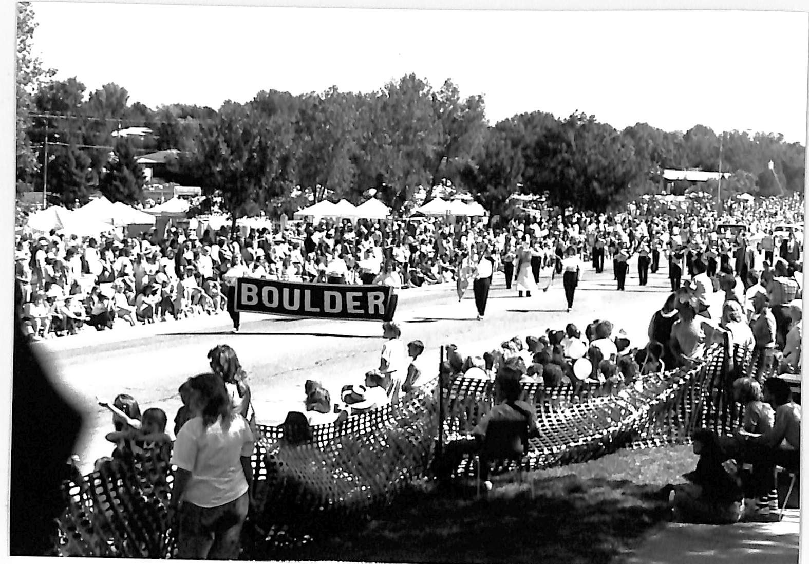 Item is a black-and-white photograph taken during the 1989 Broomfield Days event. In the photo, a parade is occurring, and crowds have gathered on both sides of the street to watch. On the side that this photo was taken from, people sit within a netted-off area. A uniformed high school marching band is making their way down the street, with two members in the front holding a banner that reads "Boulder," indicating that the students attend Boulder High School. Behind the crowds, white tents hosting other festivities and large trees frame the background.Photograph Details