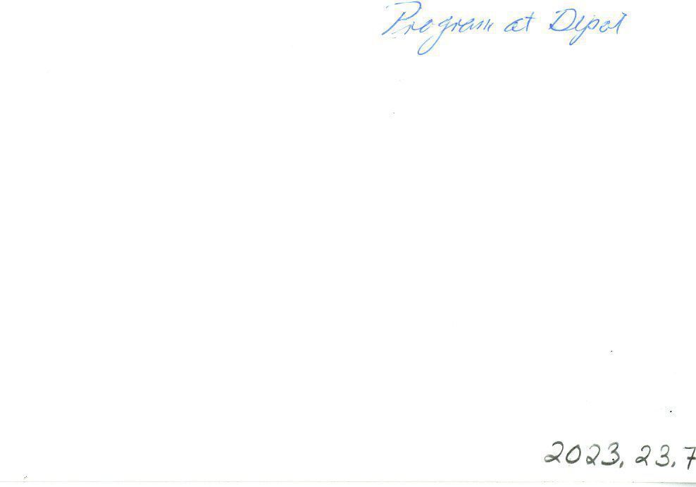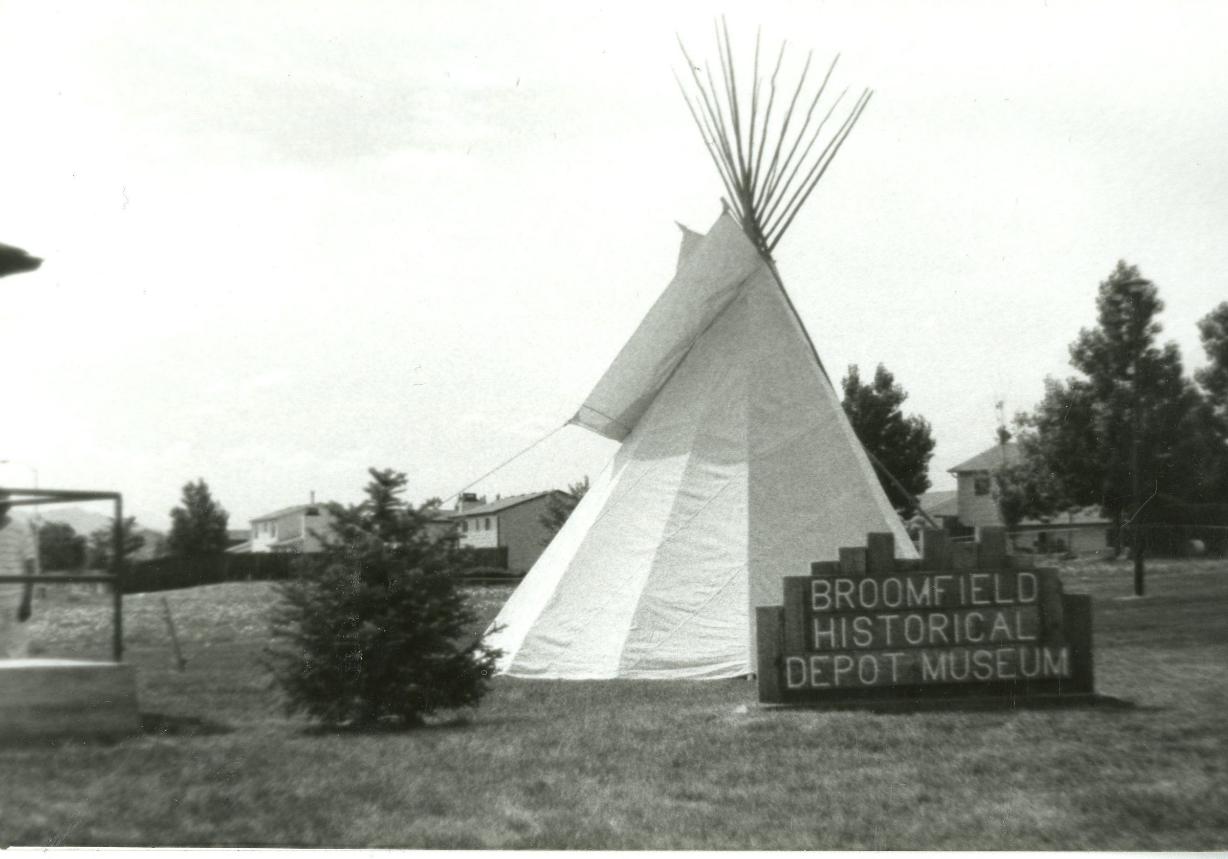 Black and white photograph showing a tepee behind the Broomfield Historical Depot Museum sign. There are houses in the background. image is 3.5 in by 5 in. Handwritten on the back is "Program at Depot."