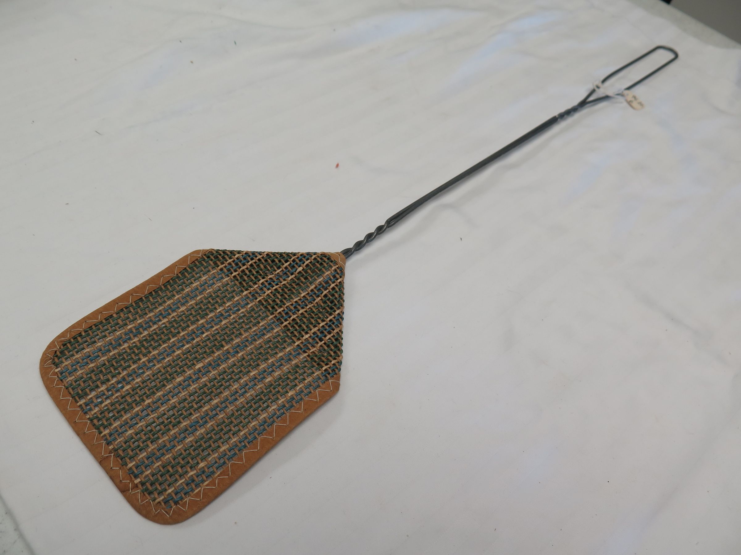 This is a green and blue woven fly swatter with a metal handle. The fly swatter measures 4.5" (w) x 22" (l).