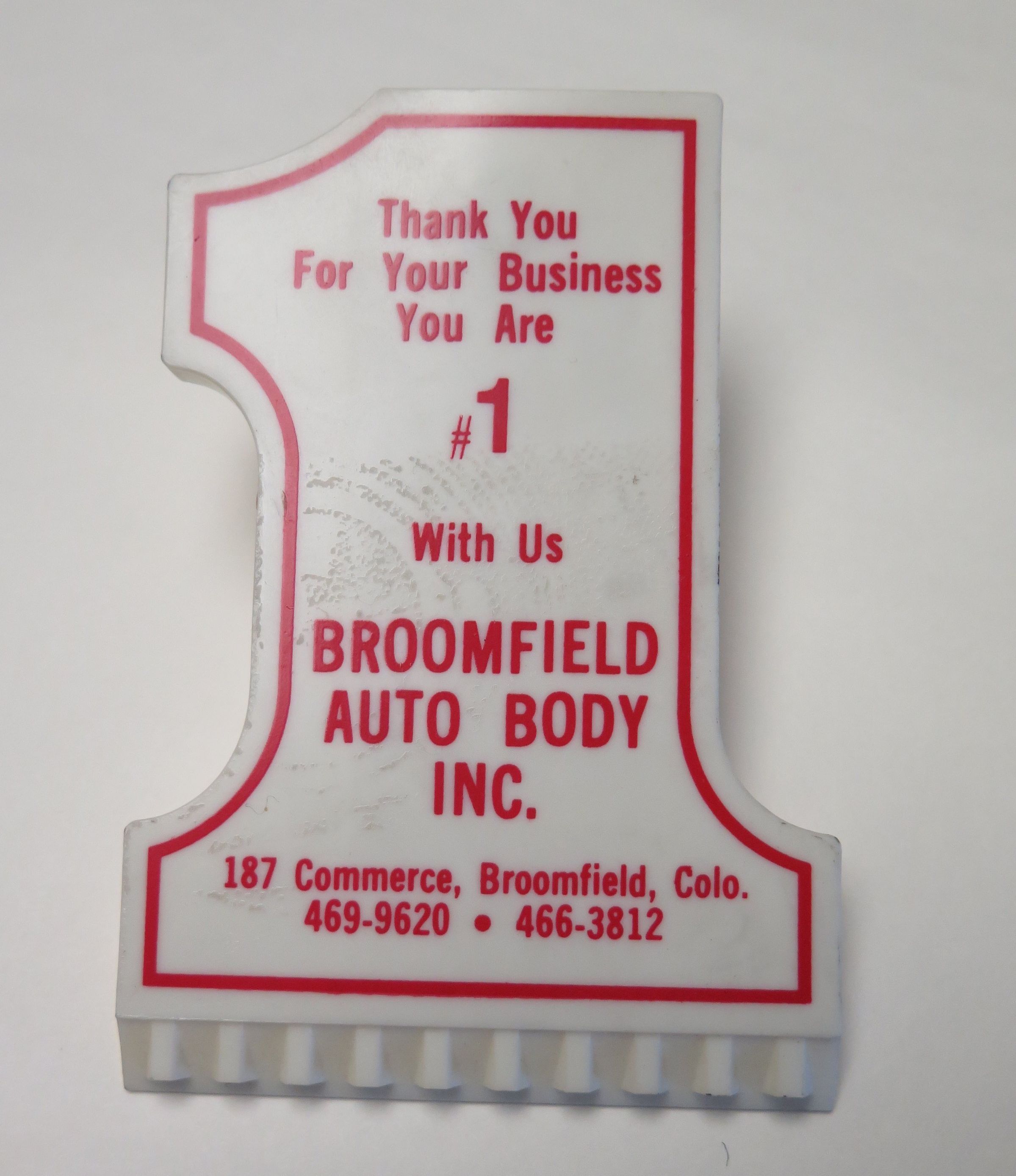This is a white plastic ice scraper in the shape of the number 1. The scraper has red text on it that reads "Thanks You/for Your Business/You Are/ #1/ WIth Us/Broomfield/Auto Body Inc./187 Commerce, Broomfield Co./469-9620, 469-3812". The scraper has a clip for clamping on to a car's visor. The scraper measures 2" (h) x 5" (l) x 3.25" (w).