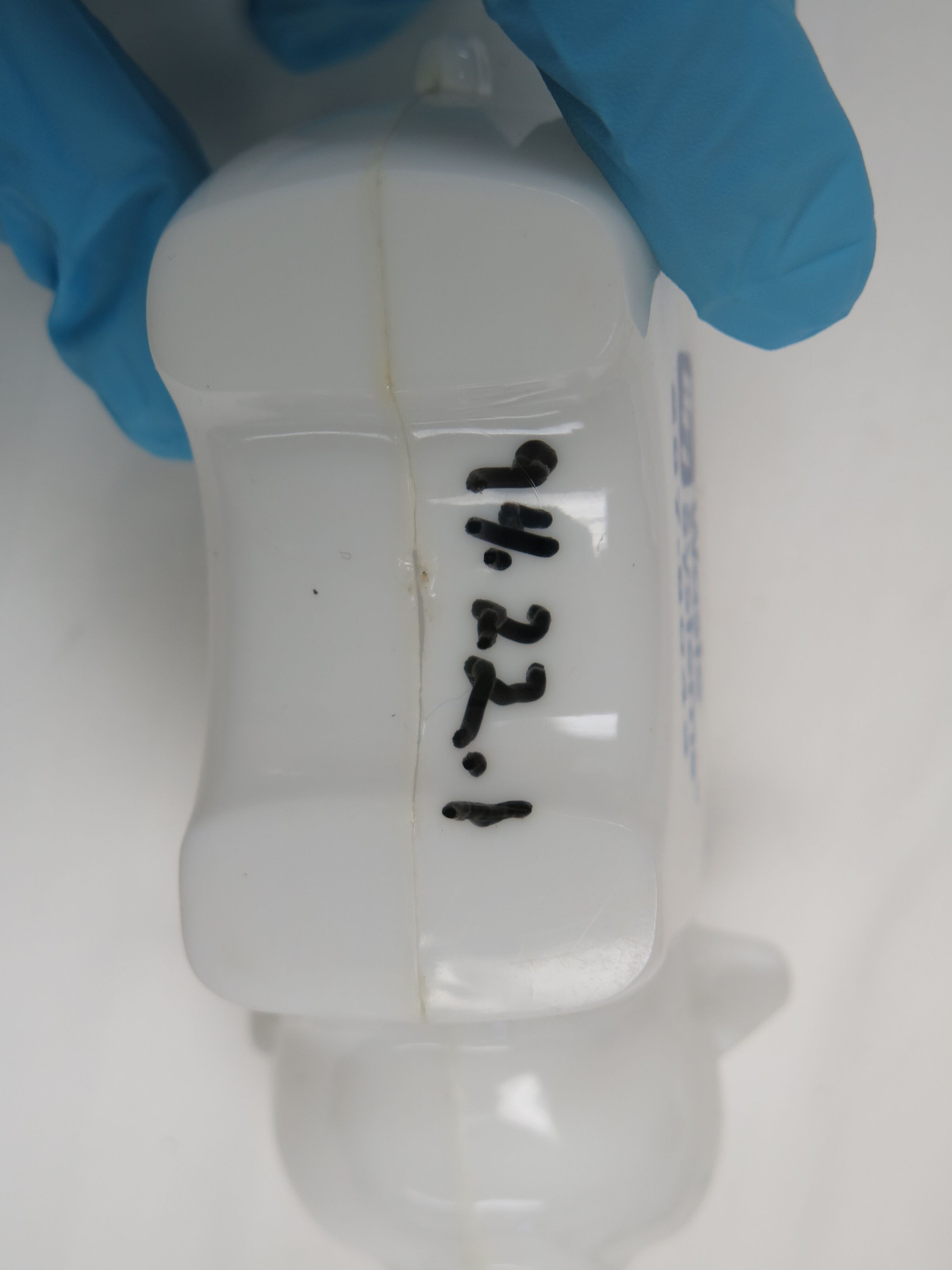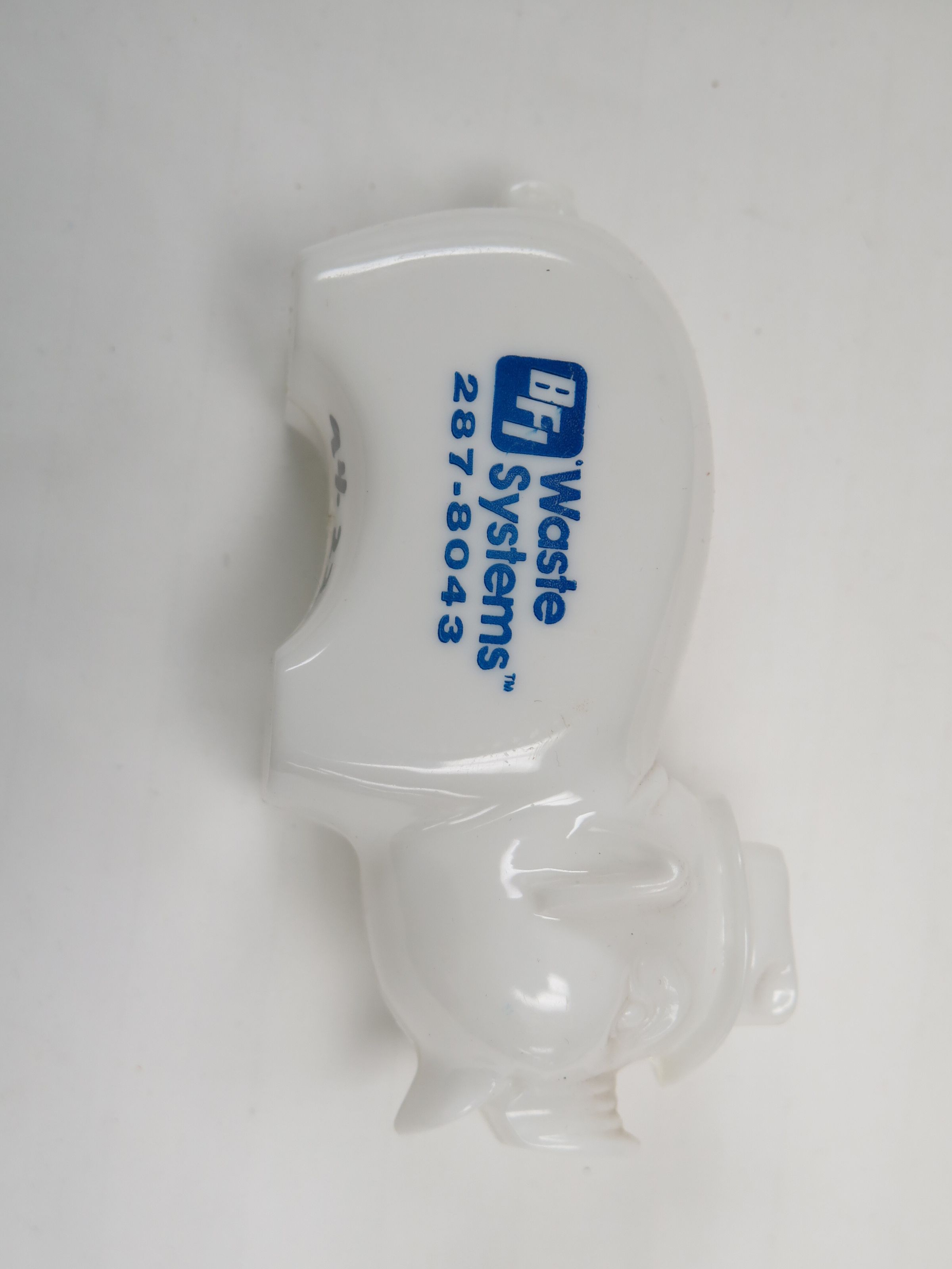 This is a miniature plastic piggy bank. The bank is white with blue text on the side that reads, "Waste/ Systems/ 287-8043". The bank measures 2.75" (h) x 2.25" (w) x 5" (l).Collection