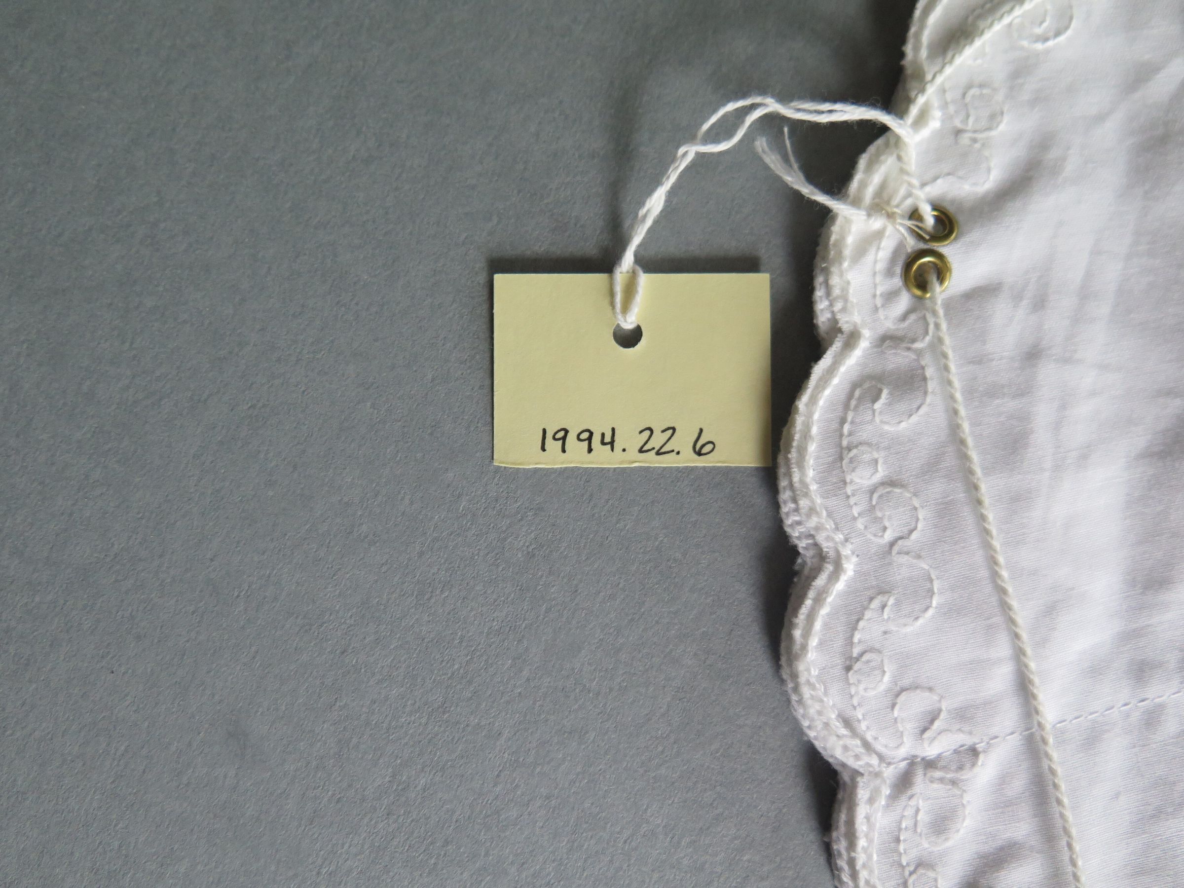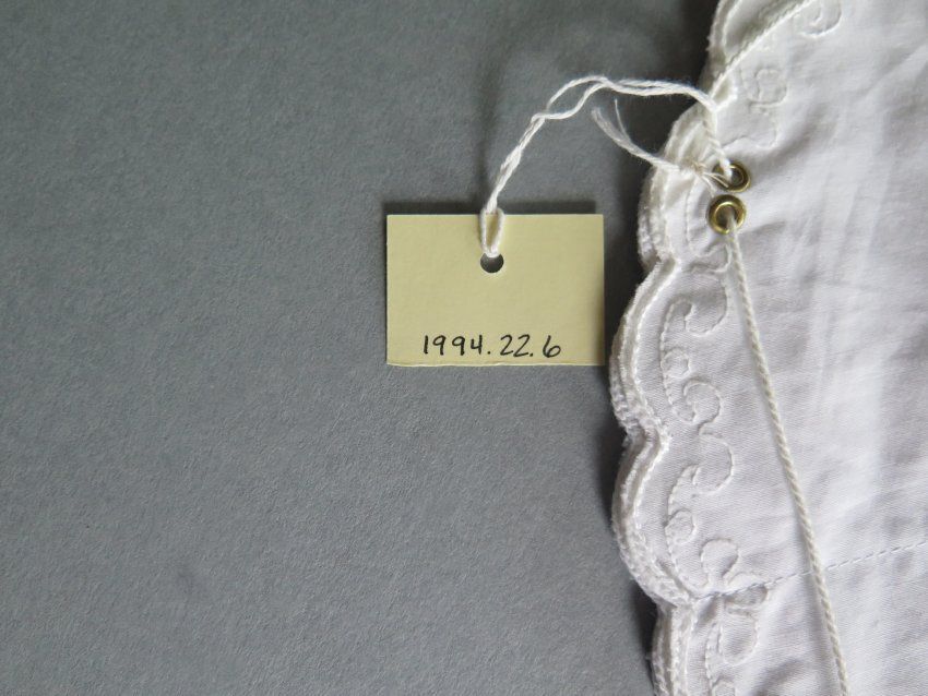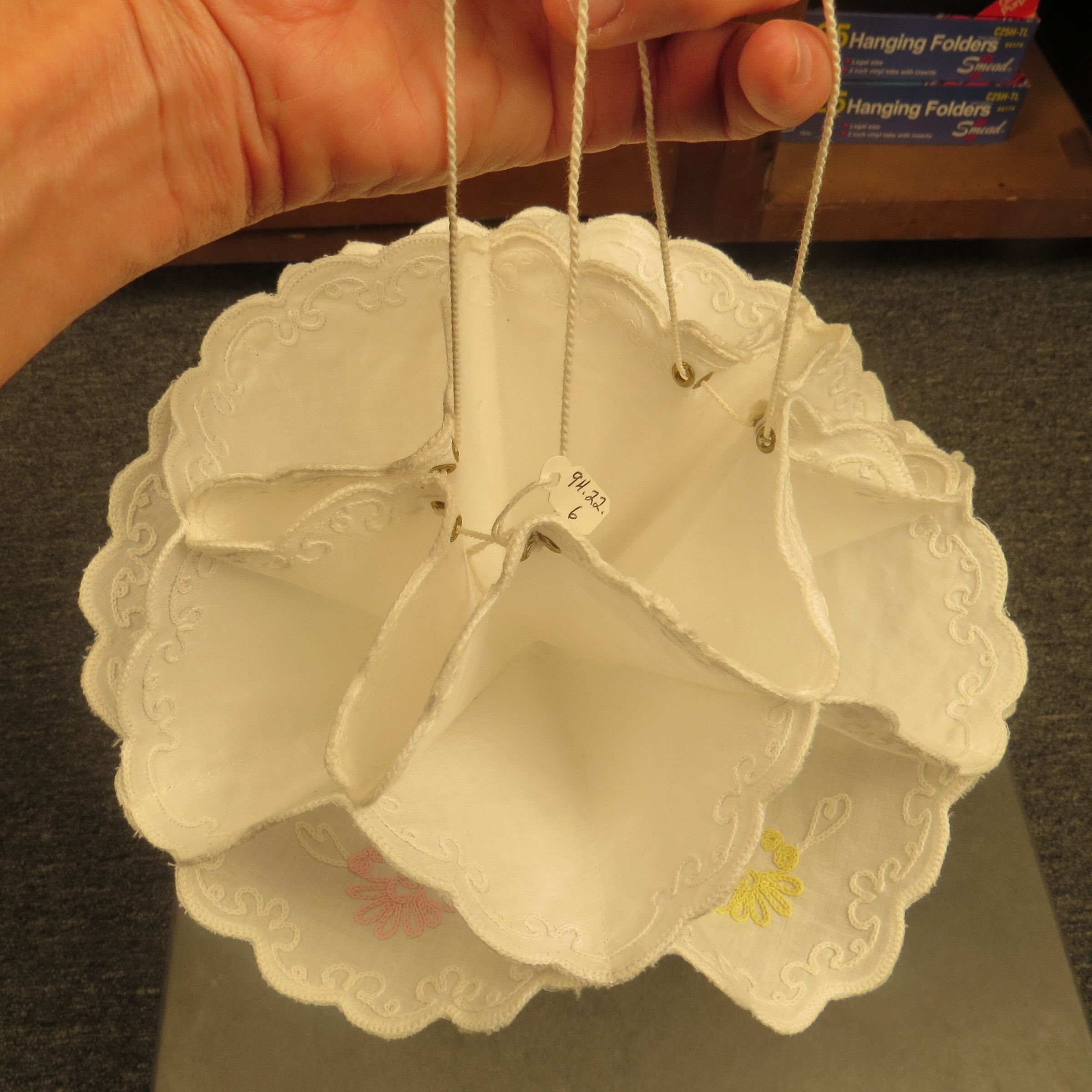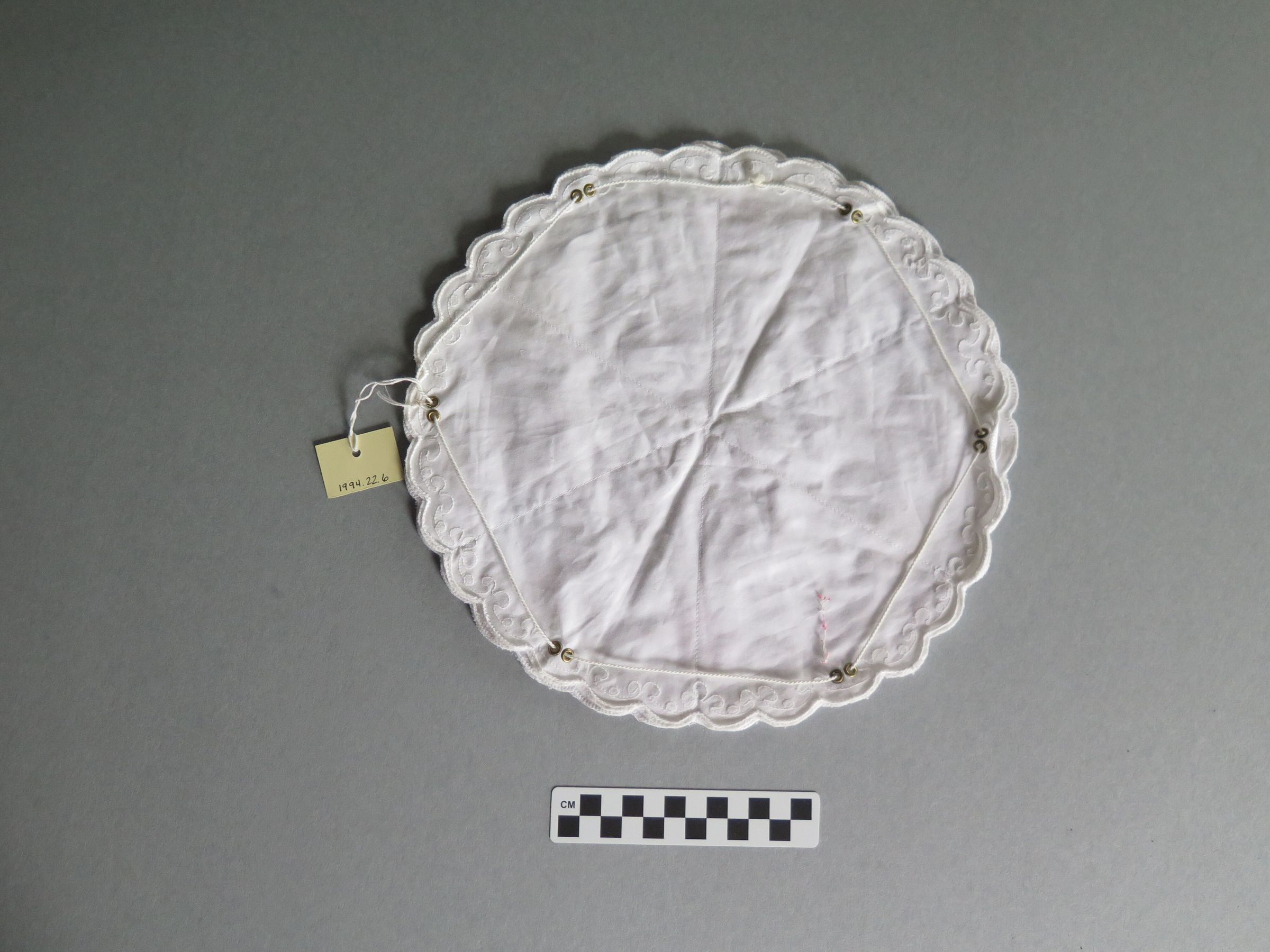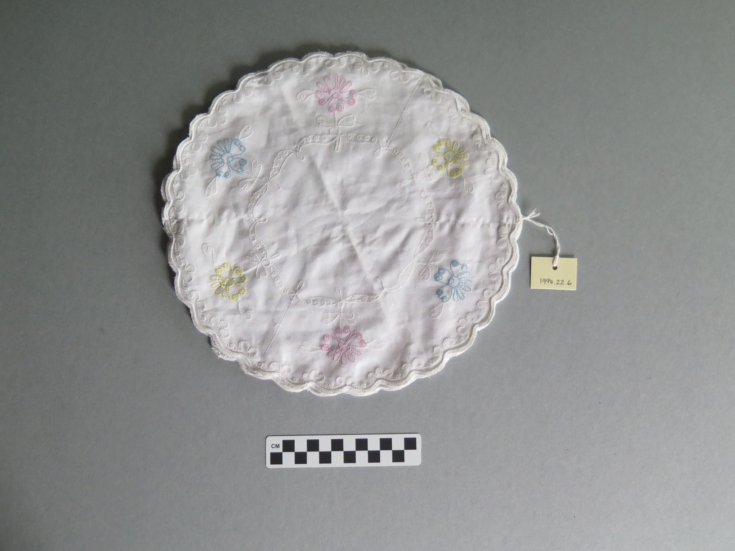 This is a white cotton hot bun holder with scalloped edges that are trimmed in white. There are two pink, two blue and two yellow flowers embroidered around the edges. There is also white embroidery connecting the colored flowers. The warmer is made of three circular pieces of fabric that are sewn together on the edges. There are pockets inside the warmer created by where the circular fabric is sewn together. The back of the warmer has six sets of two grommets. There is a white string that attaches all of the grommets, allowing for the warmer to be held up and the buns to be placed inside. The warmer measures 11" (diam).