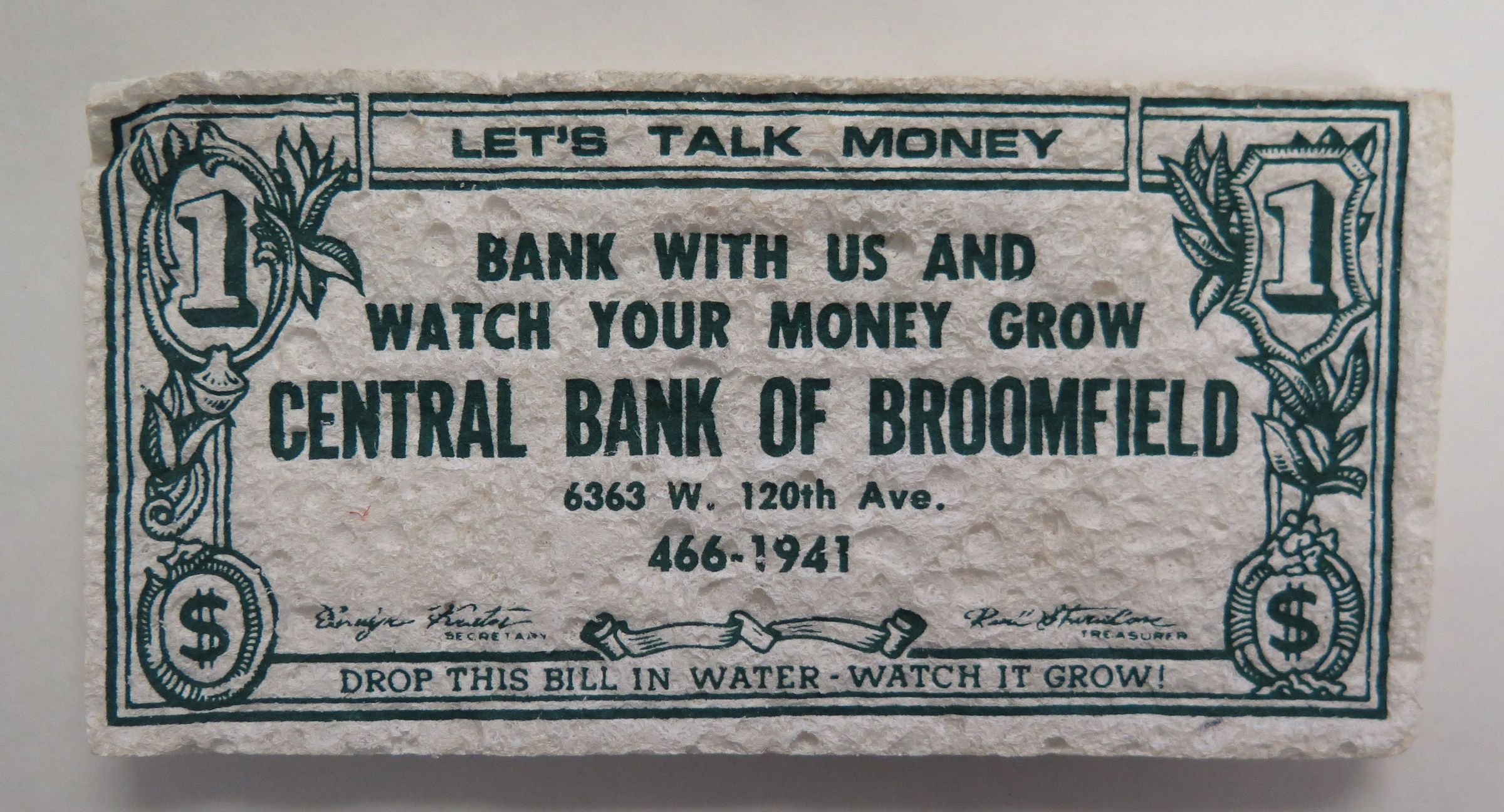 This is a promotional Sponge 2.5"(H) x 5.5"(W) for the Central Bank Broomfield. It is white in color with green text and graphics.