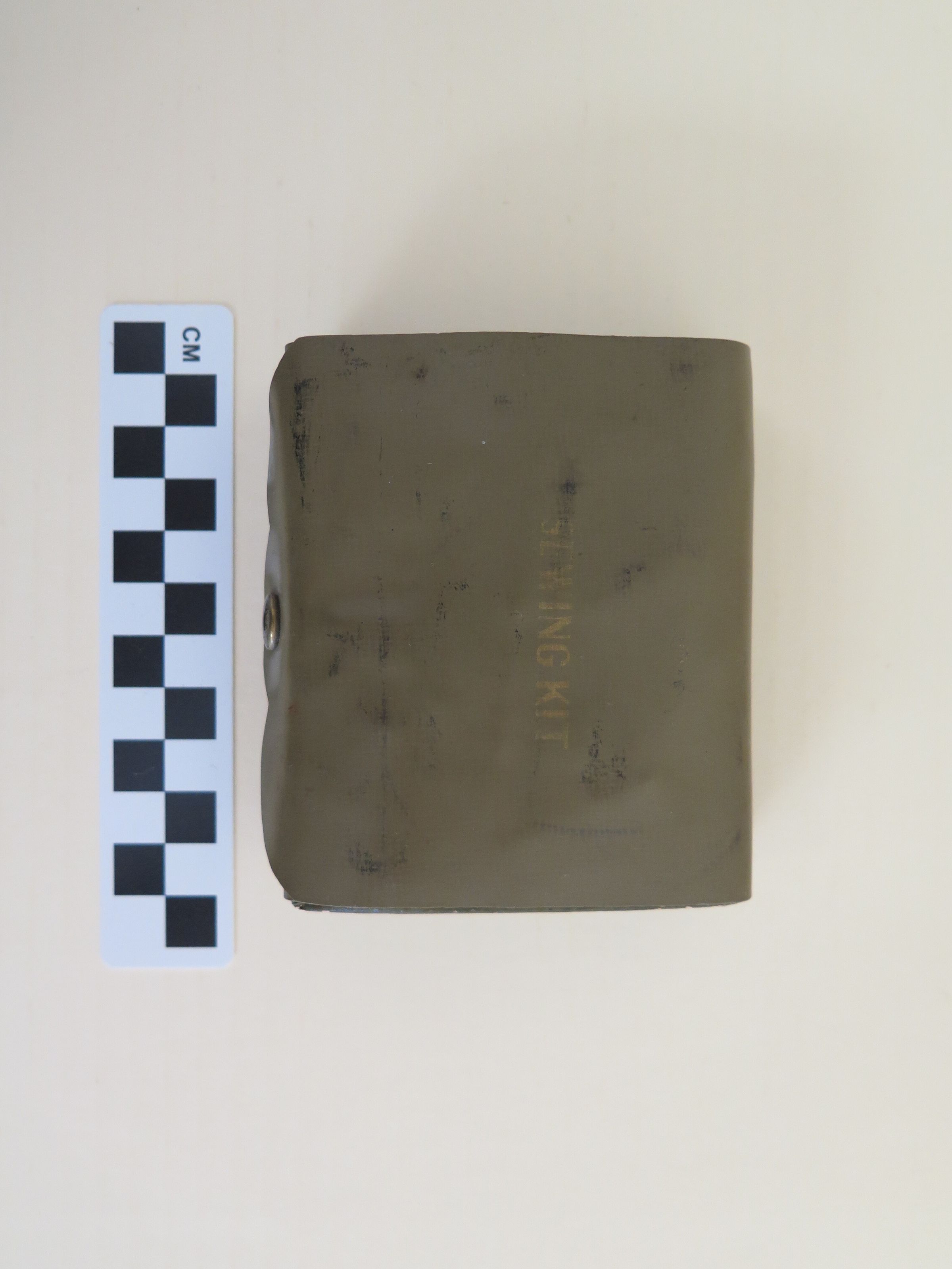 This is an Army Sewing Kit with a snap flap closure. Inside the sewing kit is: metal scissors, 6 spools of thread, a toilet paper roll with thread wrapped around it, many needles, and safety pins. The kit measures 1.5" (h) x 3.75" (w) x 3" (l).