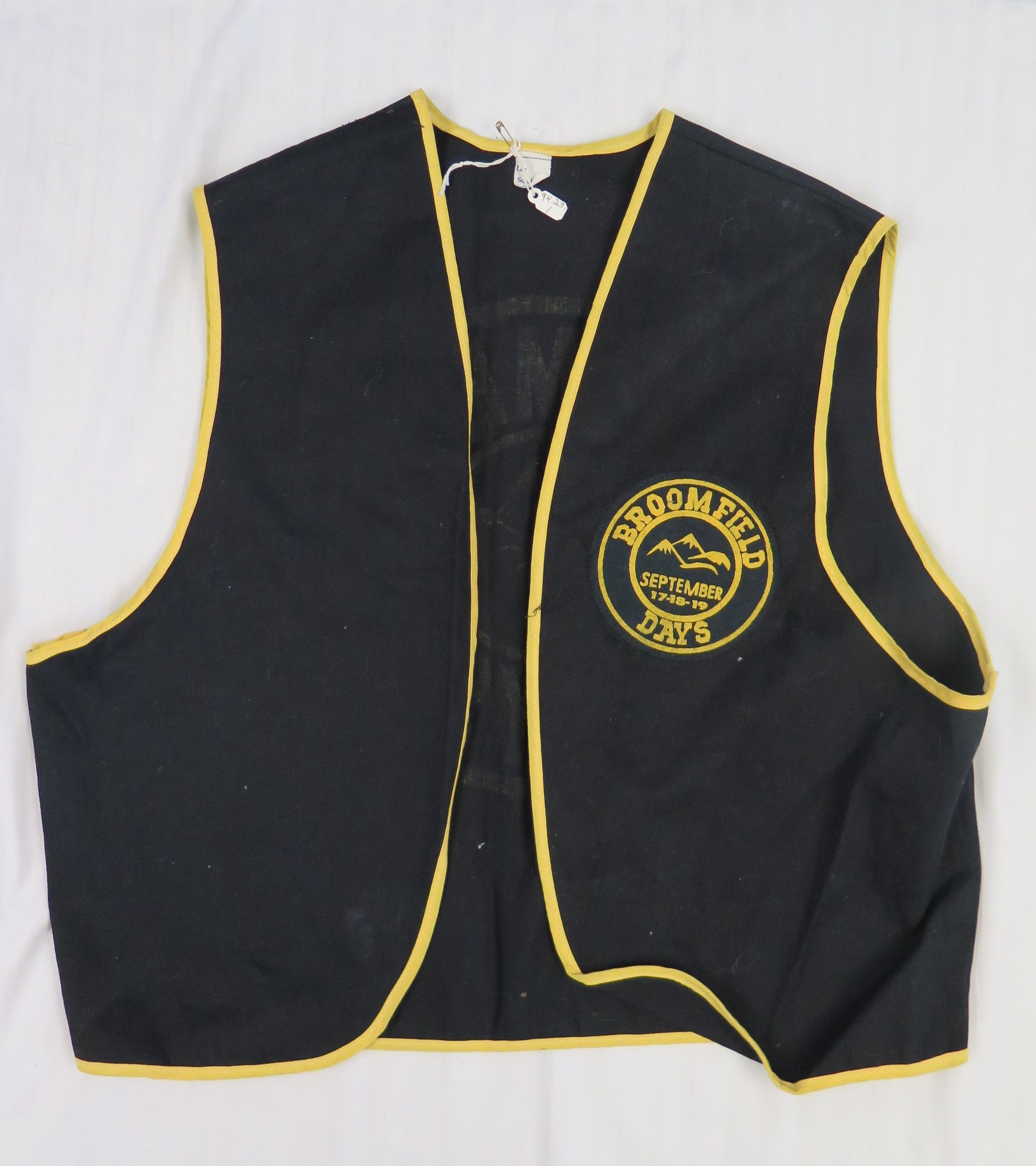This is a black vest from Broomfield Days. There is a yellow logo on the front left chest that reads, "Broomfield Days/ September/ 17-18-19". The vest measures 18" (w) x 19.5" (l).