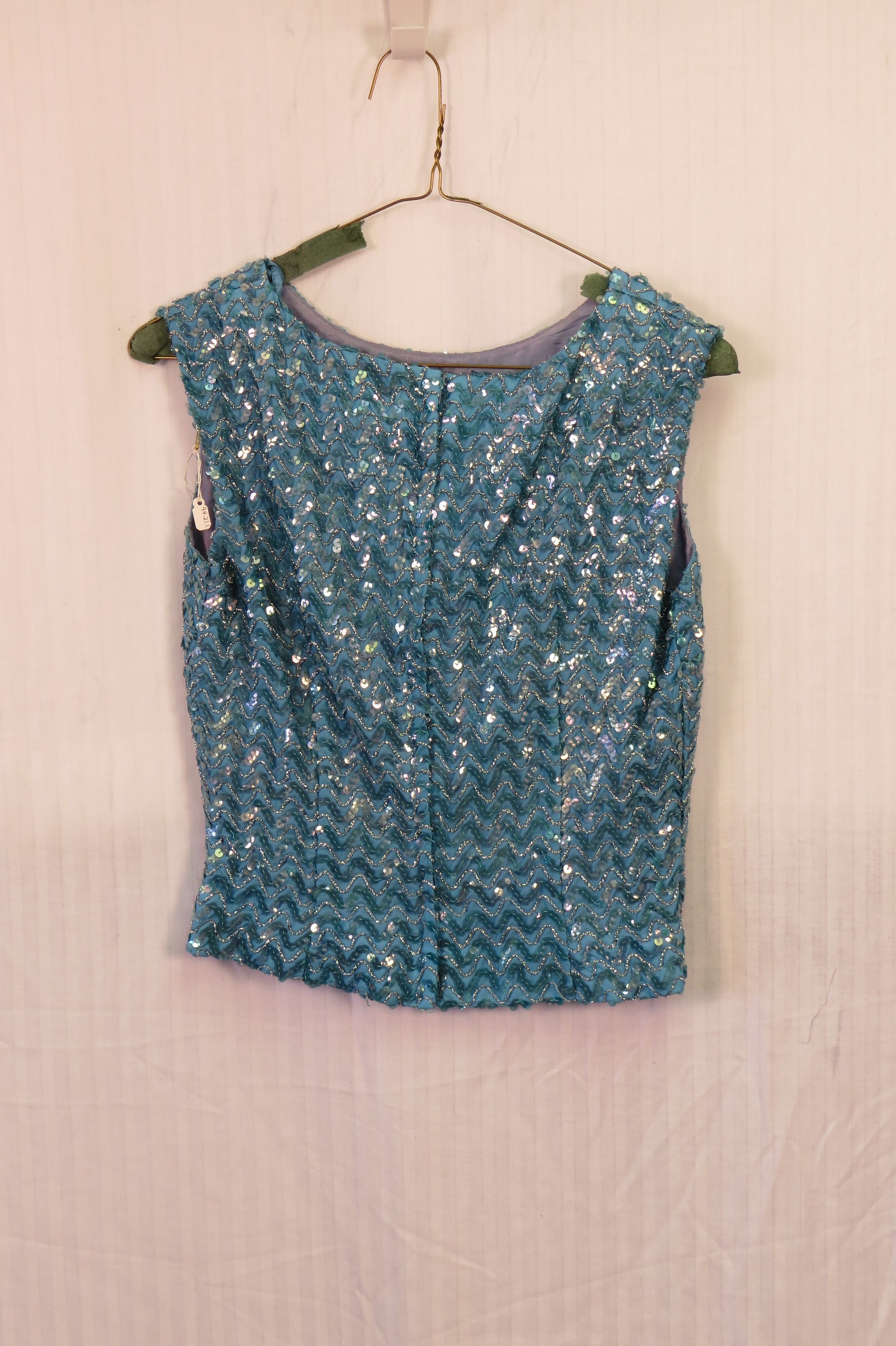 The is an aqua colored sequined sleeveless blouse. The blouse measures 13.5" (w) x 18.5" (l). Note: This was recommended for disposal by Megan Huelman in October 2013 (TTempleman 06/30/2017).