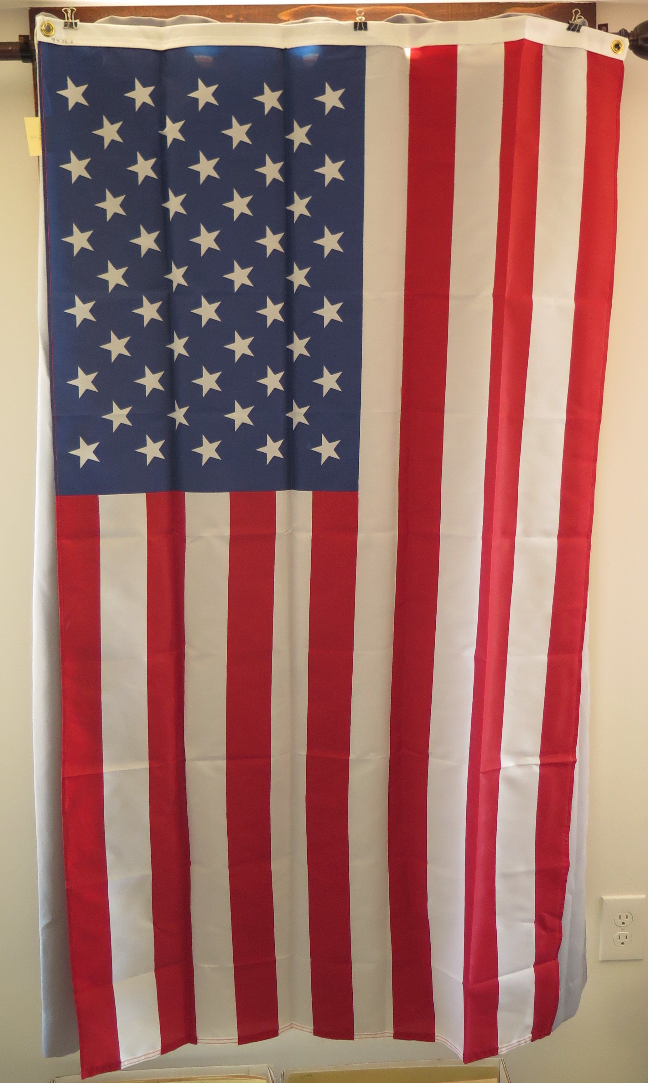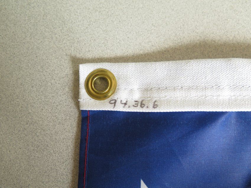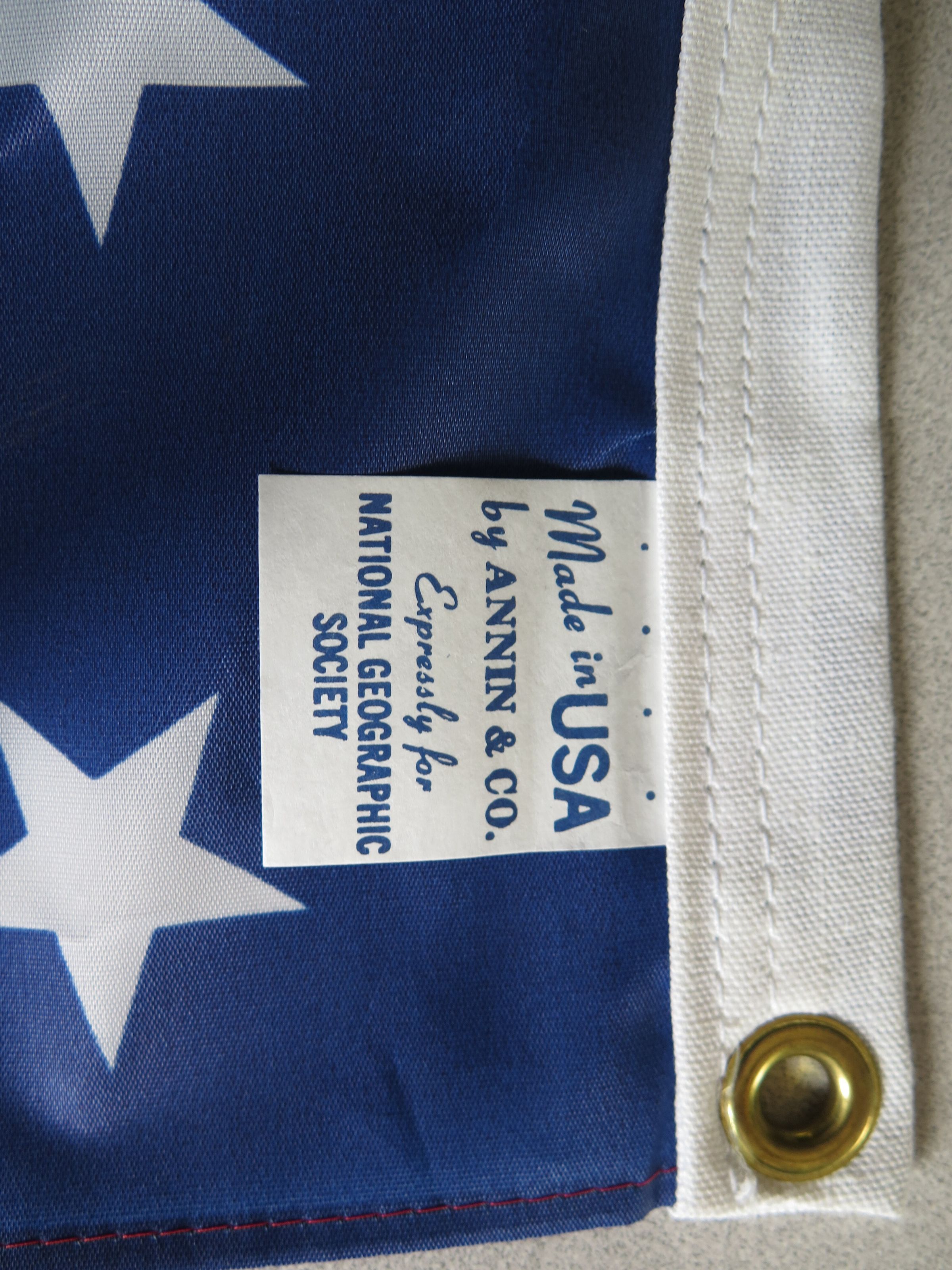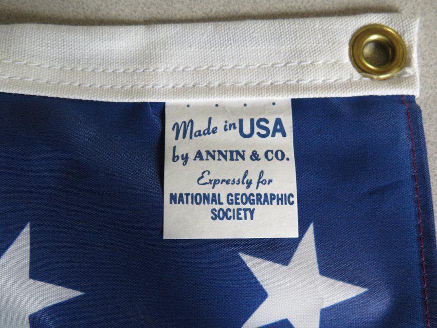 This is an American flag. The tag reads "Made in the USA by Annin & Co. Expressly for National Geographic Society." The flag measures 38" (w) x 62" (l).