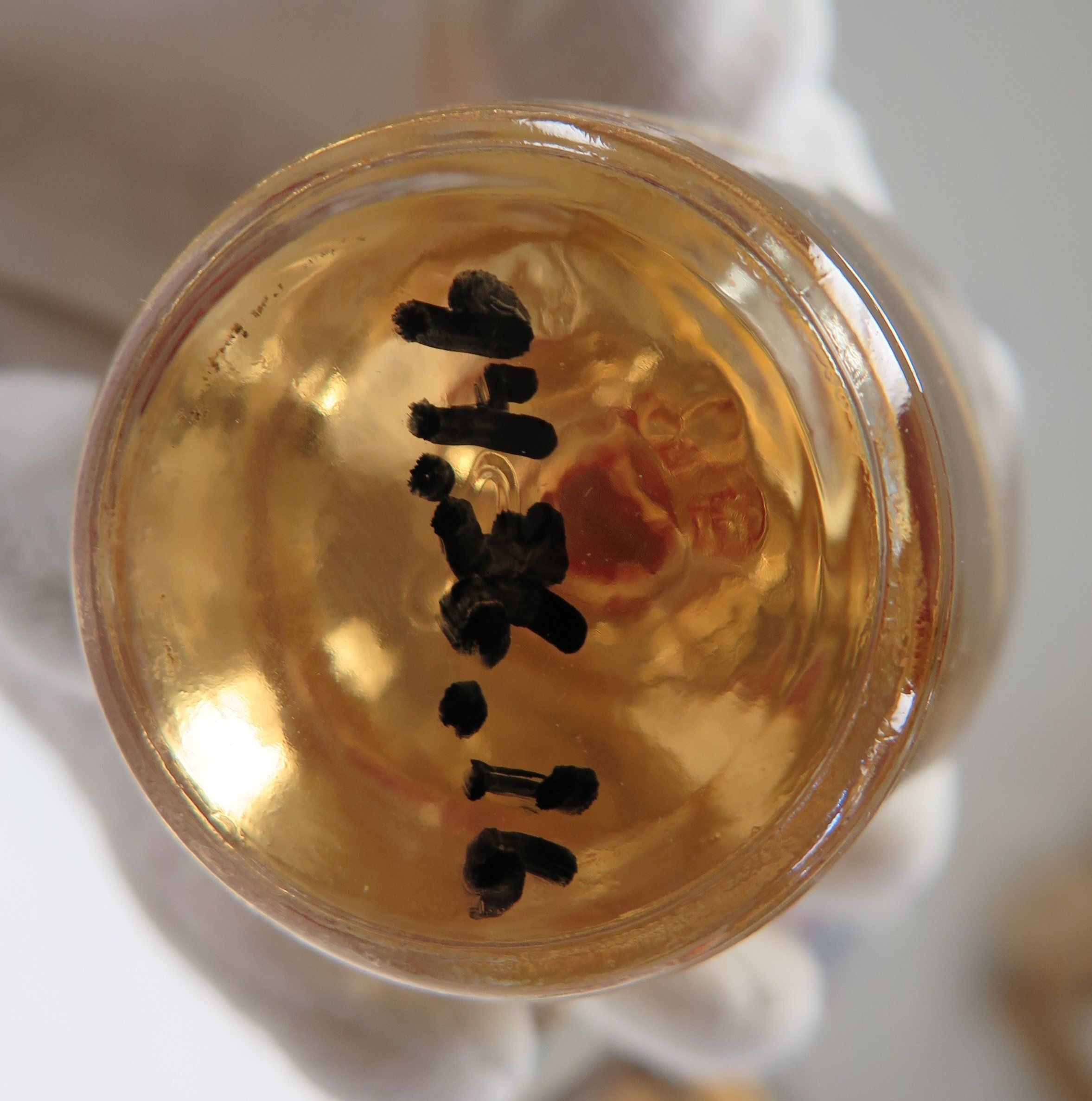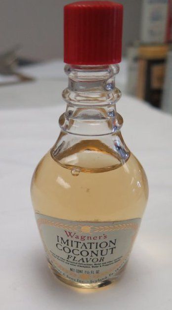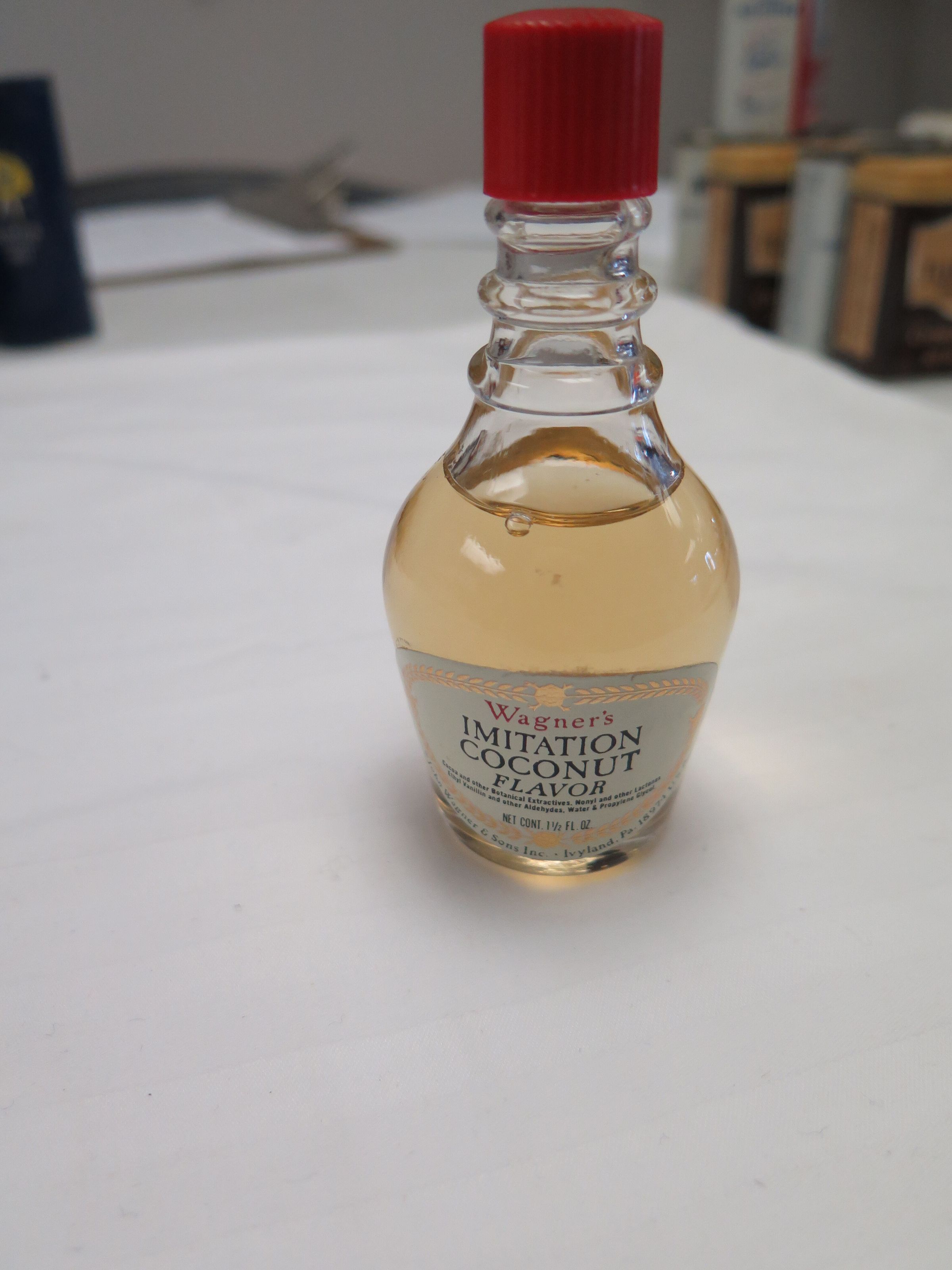 This is a clear glass bottle of Coconut Flavoring with a red plastic top. The white sticker on the front of bottle has blue text that reads, "Wagner's/ Imitation/ Coconut/ Flavor/ Cocoa and other Botanical Extractives, Nonyl and other Lactonas/ Ethanol Vanillian and other Aldehydes, Water & Propylene Glycol/ Net Cont. 1 1/2 fl. oz.". The bottle measures 3.75" (h) x 1" (dia).Collection