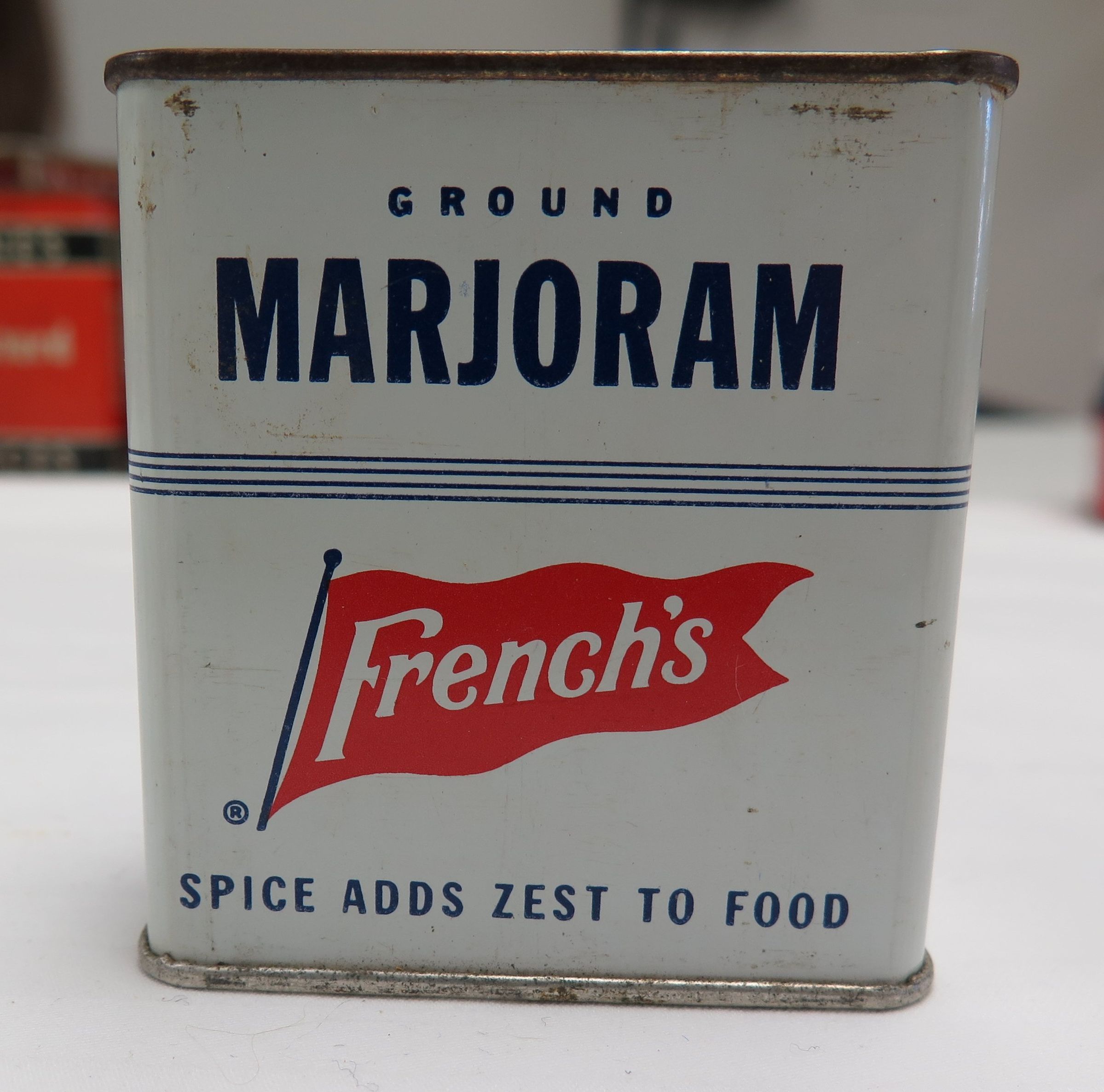 This is a metal tin of French's brand ground Marjoram spice. The tin measures 2.5" (h) x 2.25" (w) x 1" (d).