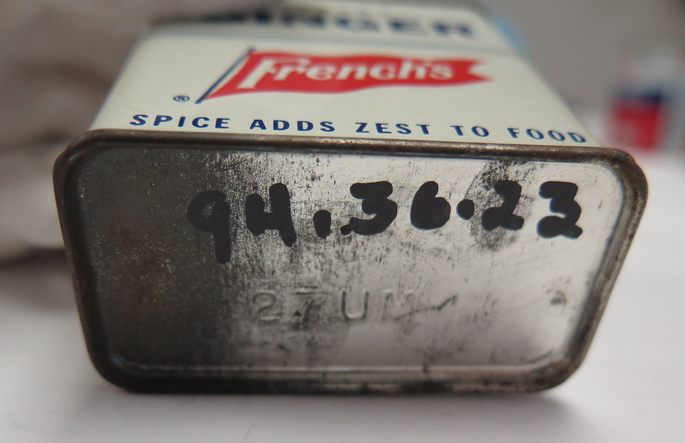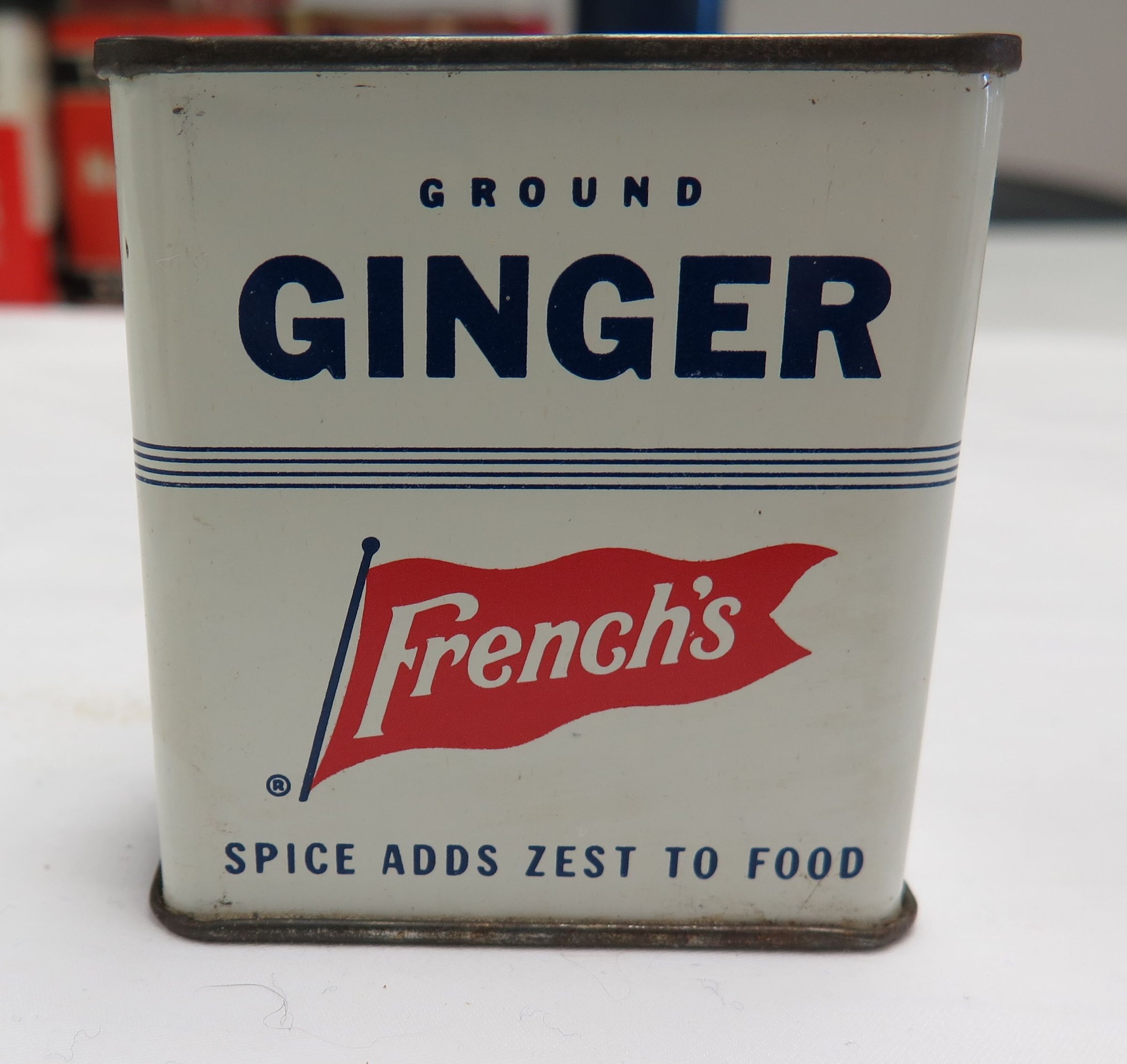 This is a metal tin of French's Ground Ginger spice. The tin is white on the sides with blue text and the red flag French's logo on the front. The tin measures 2.5" (h) x 2.25" (w) x 1" (d).Collection