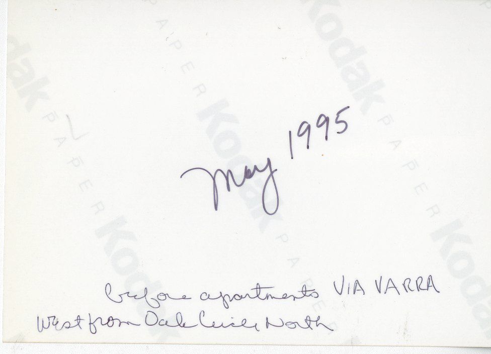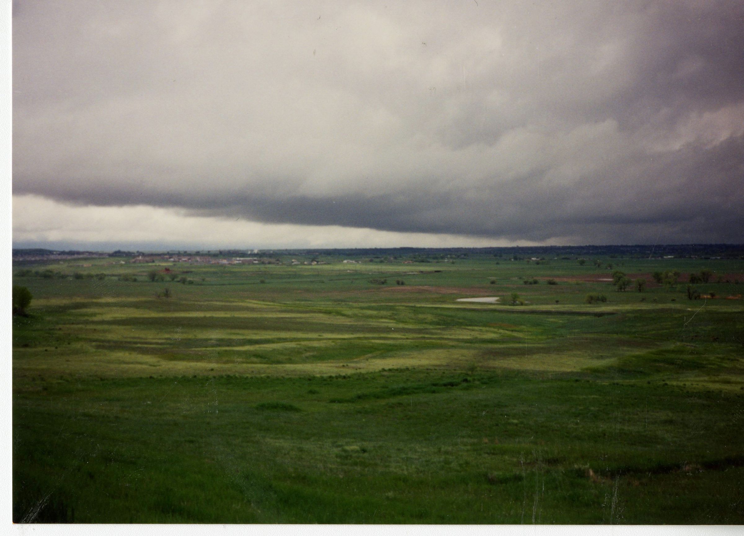 Color photograph of a green field. Photograph was taken looking west from Oak Circle North in the Lac Amora neighborhood in Broomfield, CO. Photograph shows where the Via Varra apartments stand today. Photograph was taken in May of 1995.