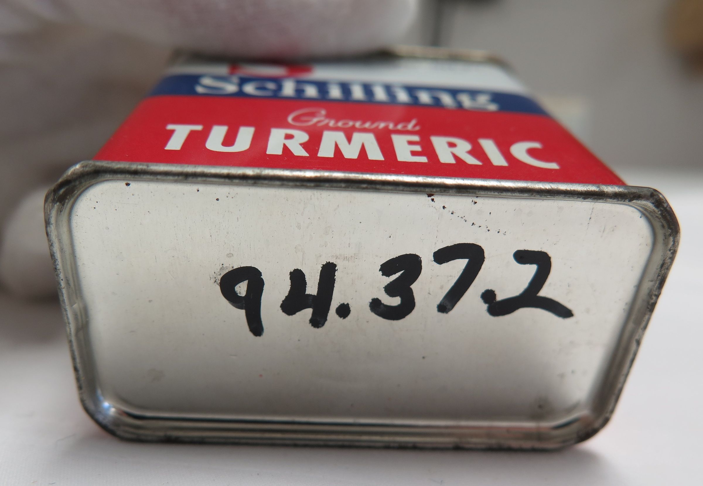 This is a metal rectangular tin of Schilling's brand Ground Turmeric spice. The tin is red, white, and blue around the sides. The tin measures 2" (h) x 2" (w) x 1" (d).Collection
