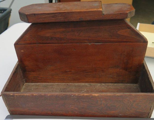 This is a wood box with equipment and supplies for shining shoes. The box measures 9" (h) x 12.5" (w) x 9.25" (d).