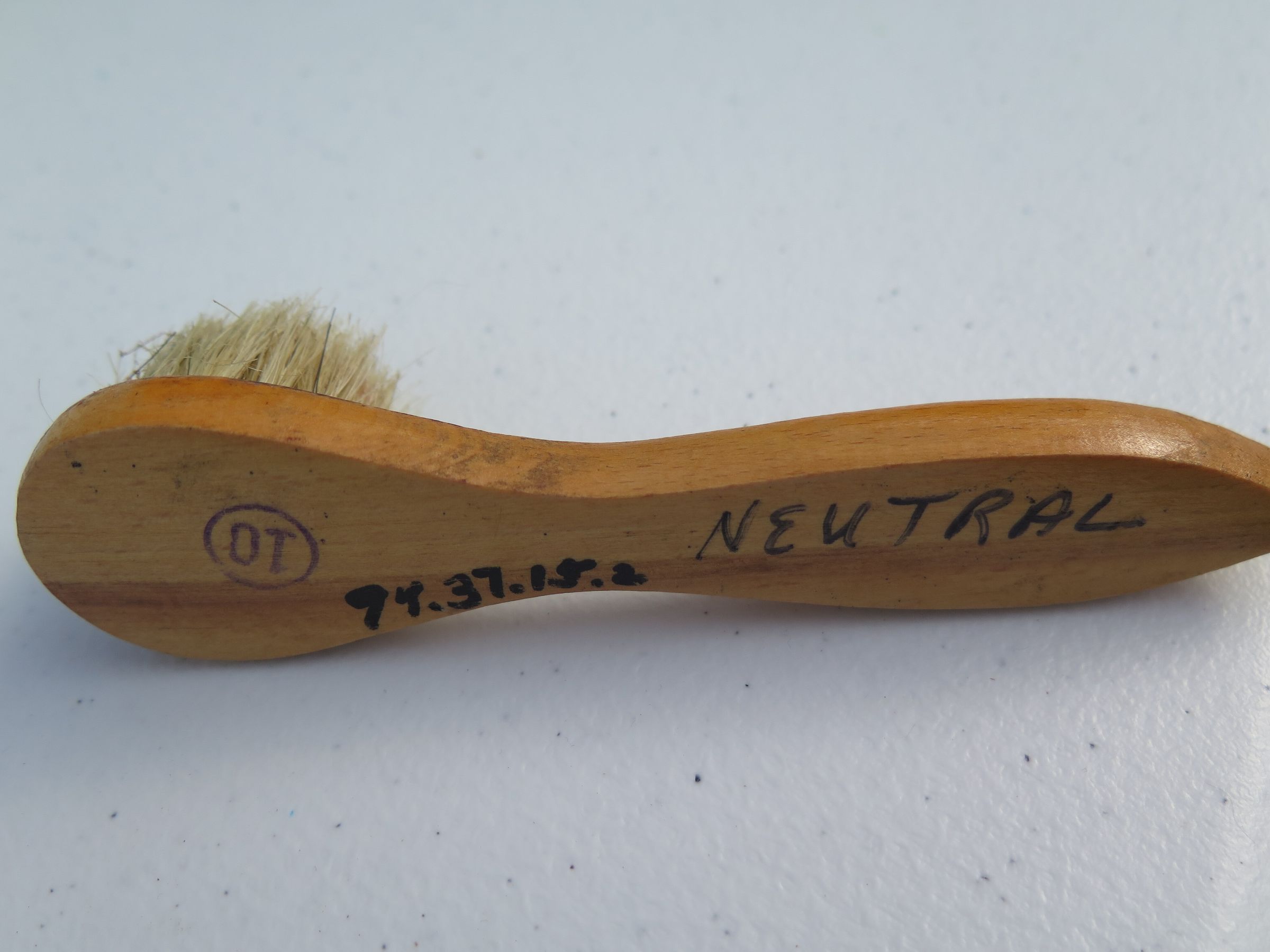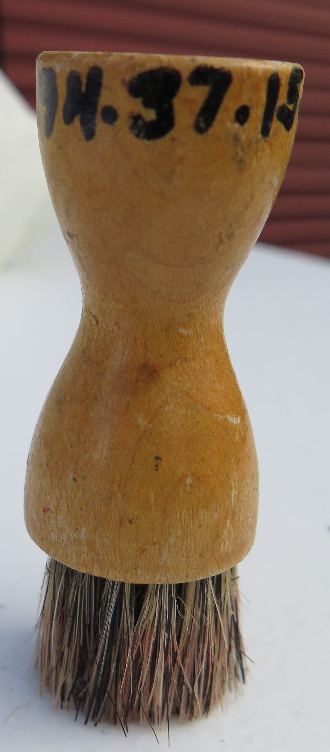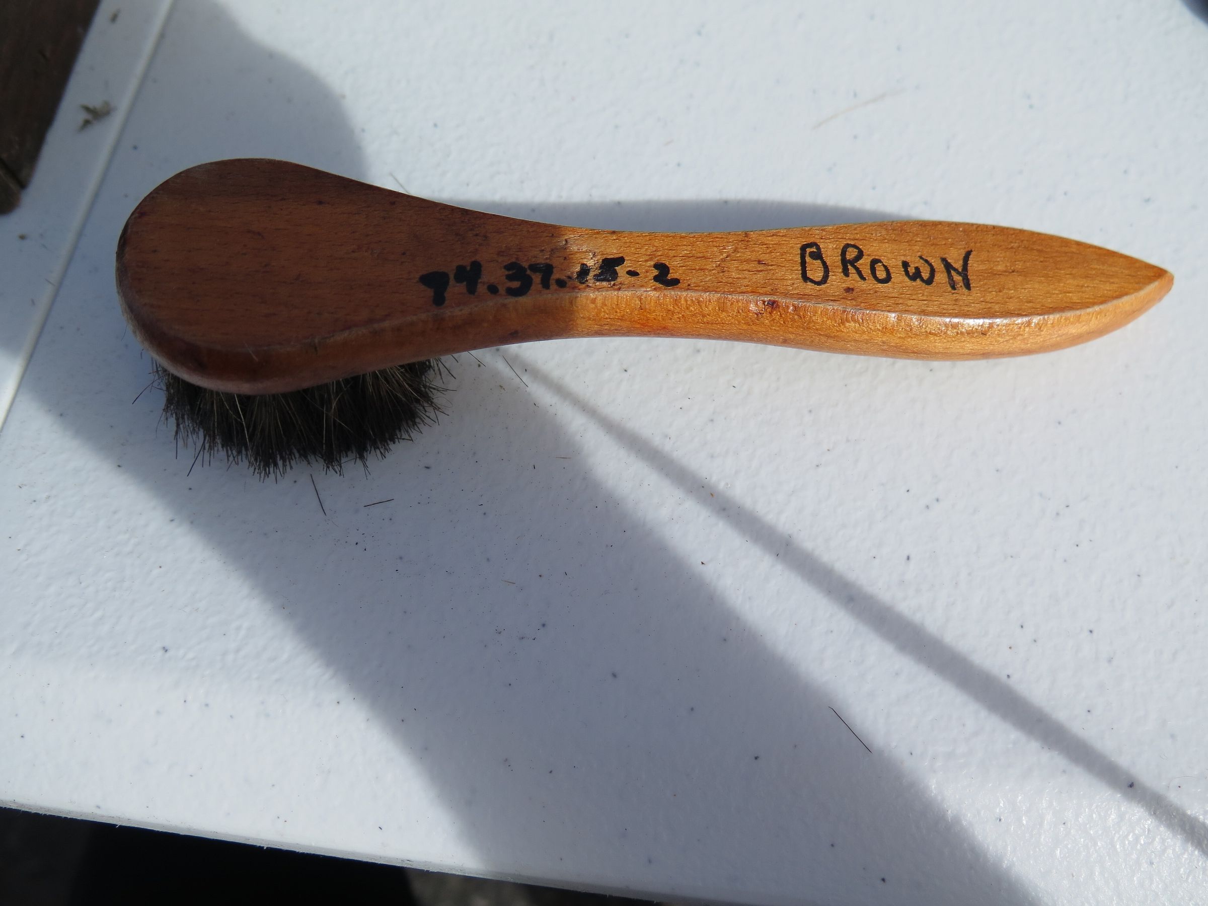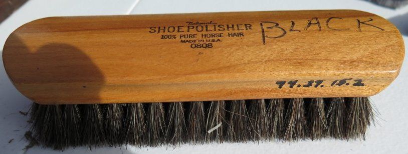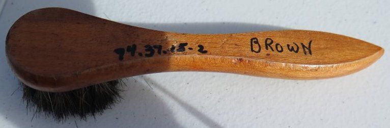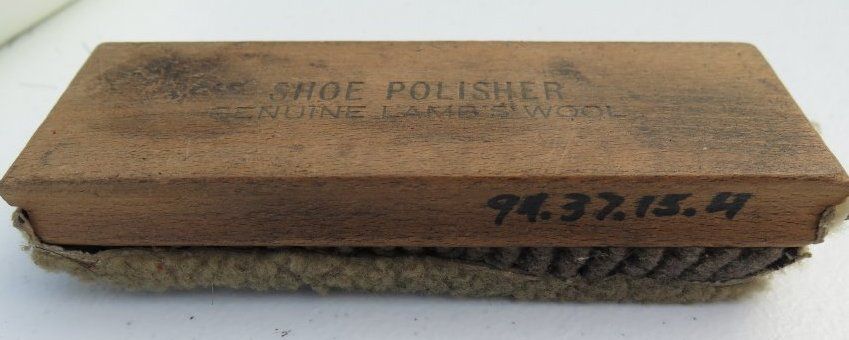 Box (1994.37.15) contains wood brush (1994.37.15.1); four brushes (all numbered 1994.37.15.2); polish brush (1994.37.15.3); polisher (1994.37.15.4); and container of black shoe polish (1994.37.15.5).