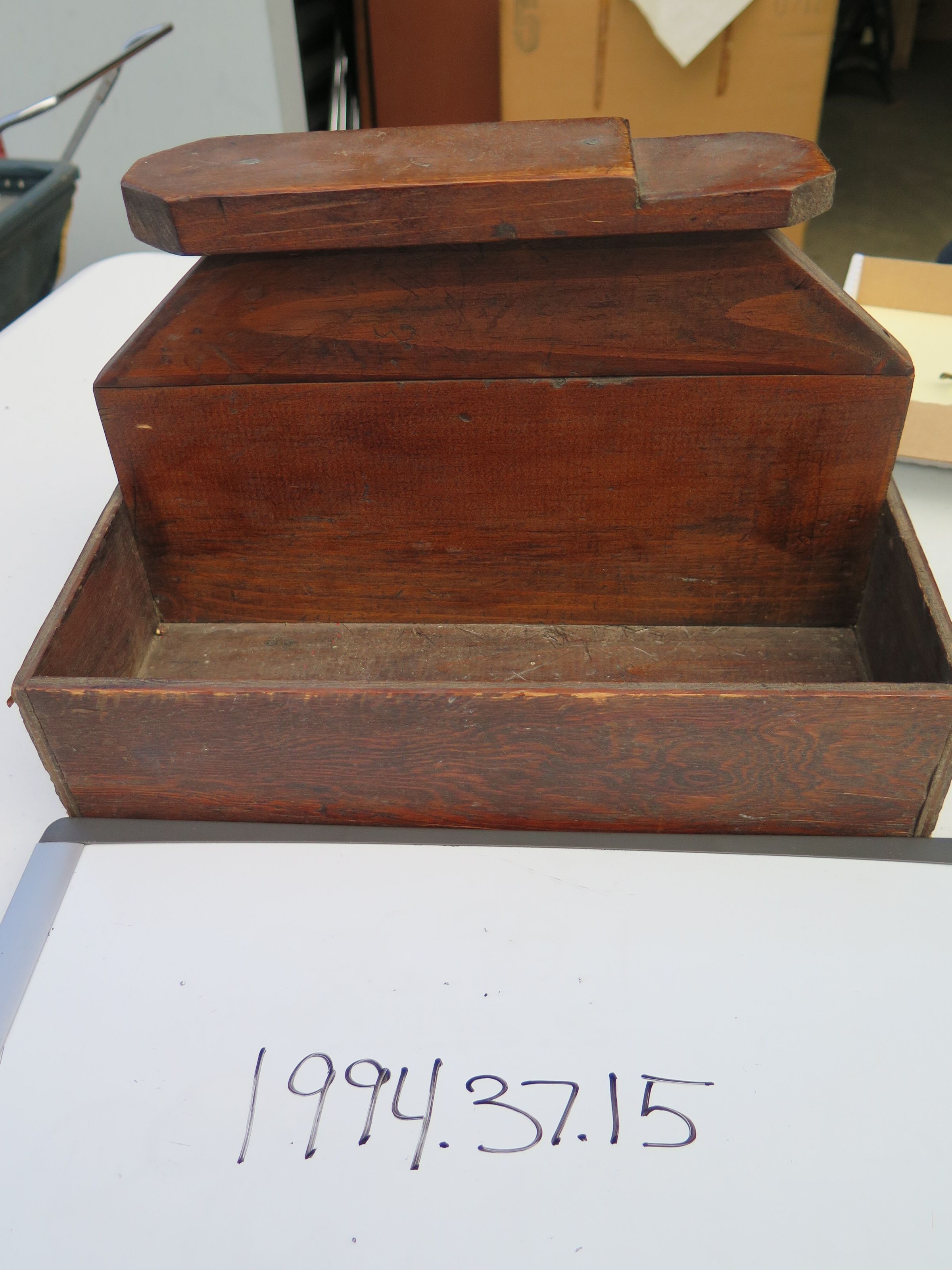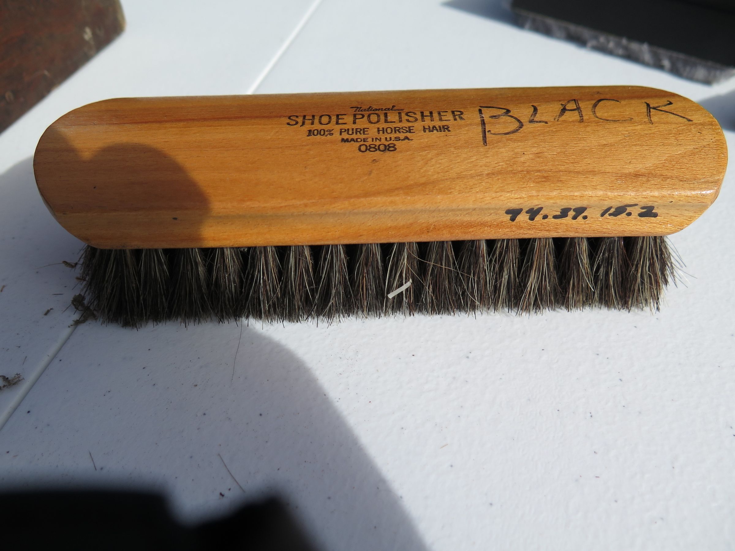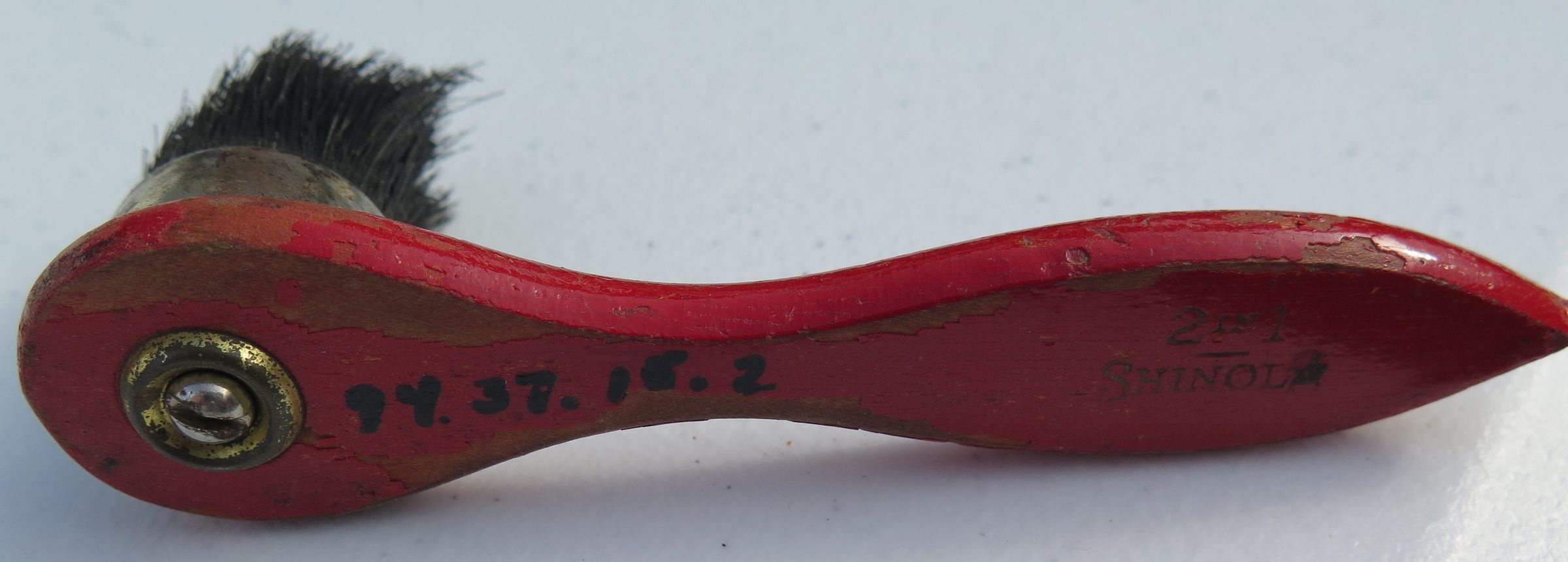 Box (1994.37.15) contains wood brush (1994.37.15.1); four brushes (all numbered 1994.37.15.2); polish brush (1994.37.15.3); polisher (1994.37.15.4); and container of black shoe polish (1994.37.15.5).