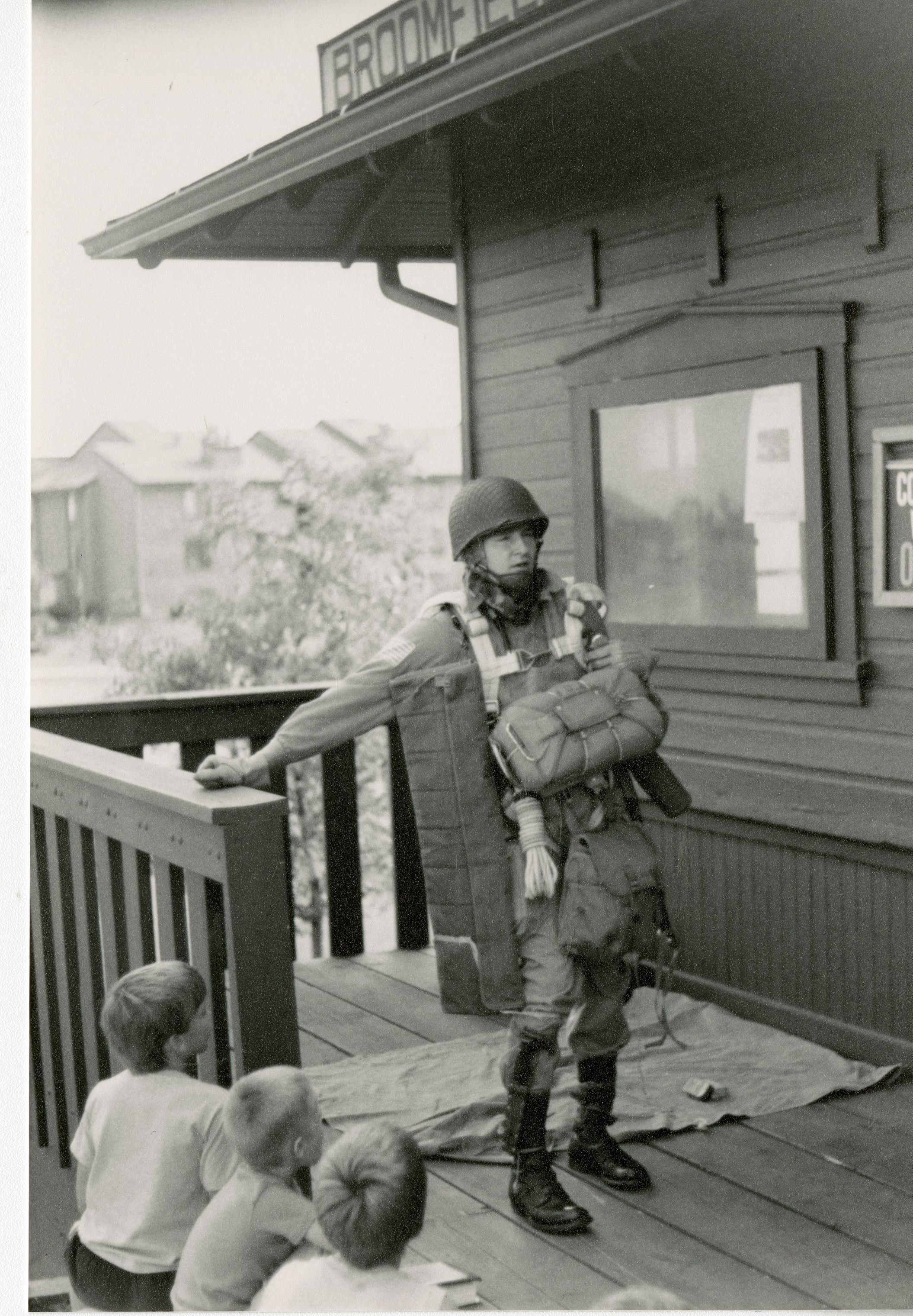 Black and white photograph of a speaker on the porch of the Broomfield Depot Museum. In the foreground with their backs to the viewer are three children. Image is 3.5 in by 5 in. Handwritten on the back is "Program at Depot."