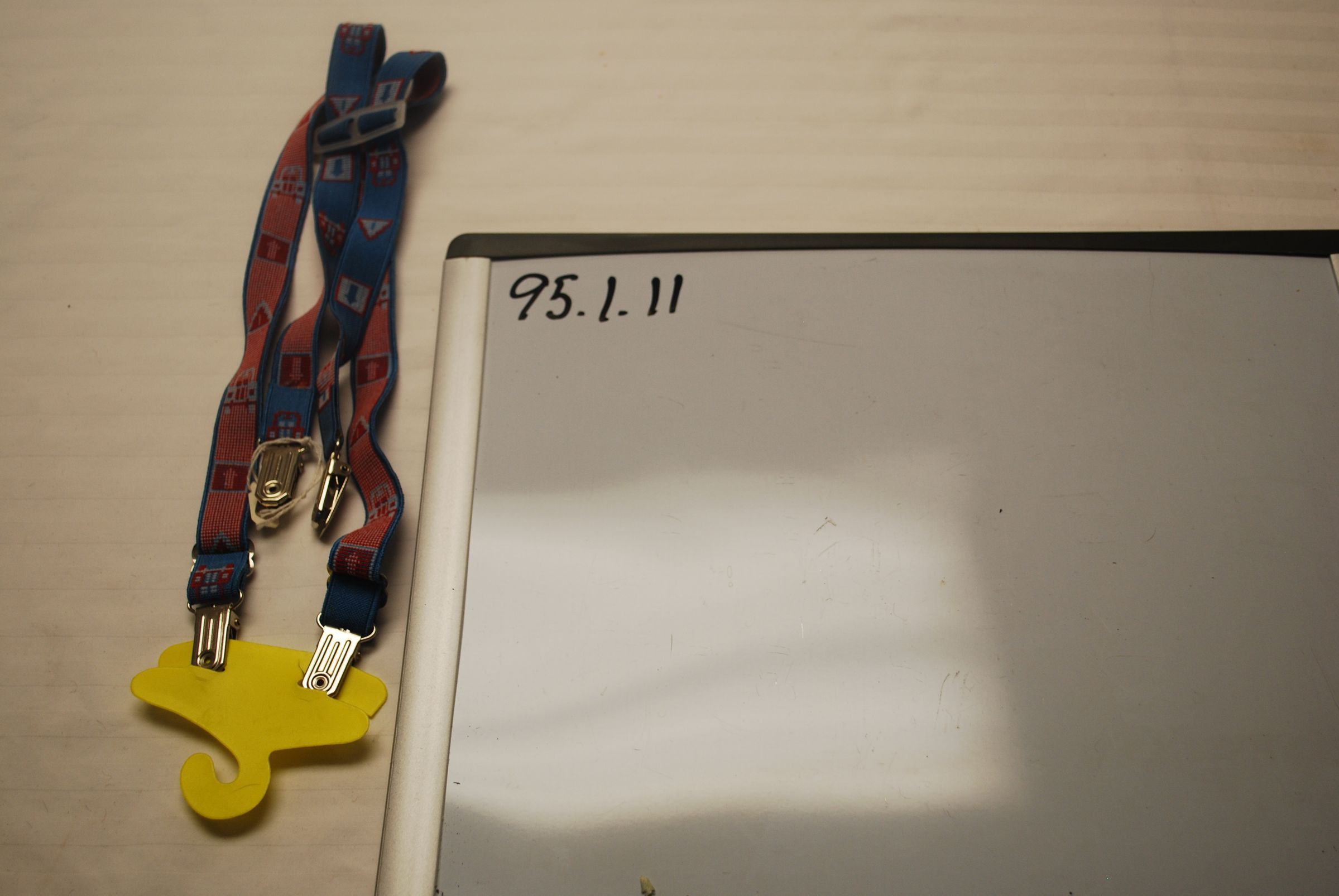 This is a set of red and blue children's suspenders with metal clasps. They are attached to a yellow hanger. The suspenders measure 22" (h) x 3"(w).