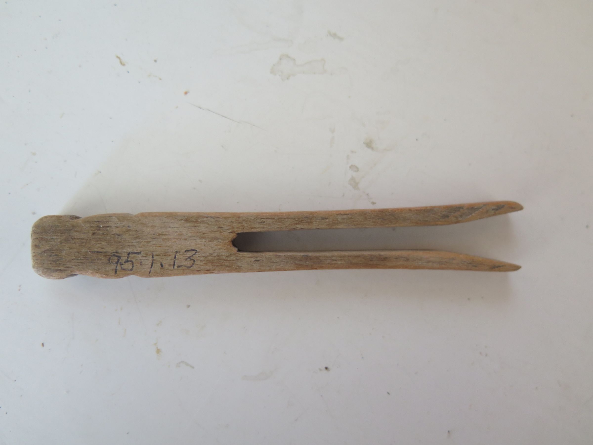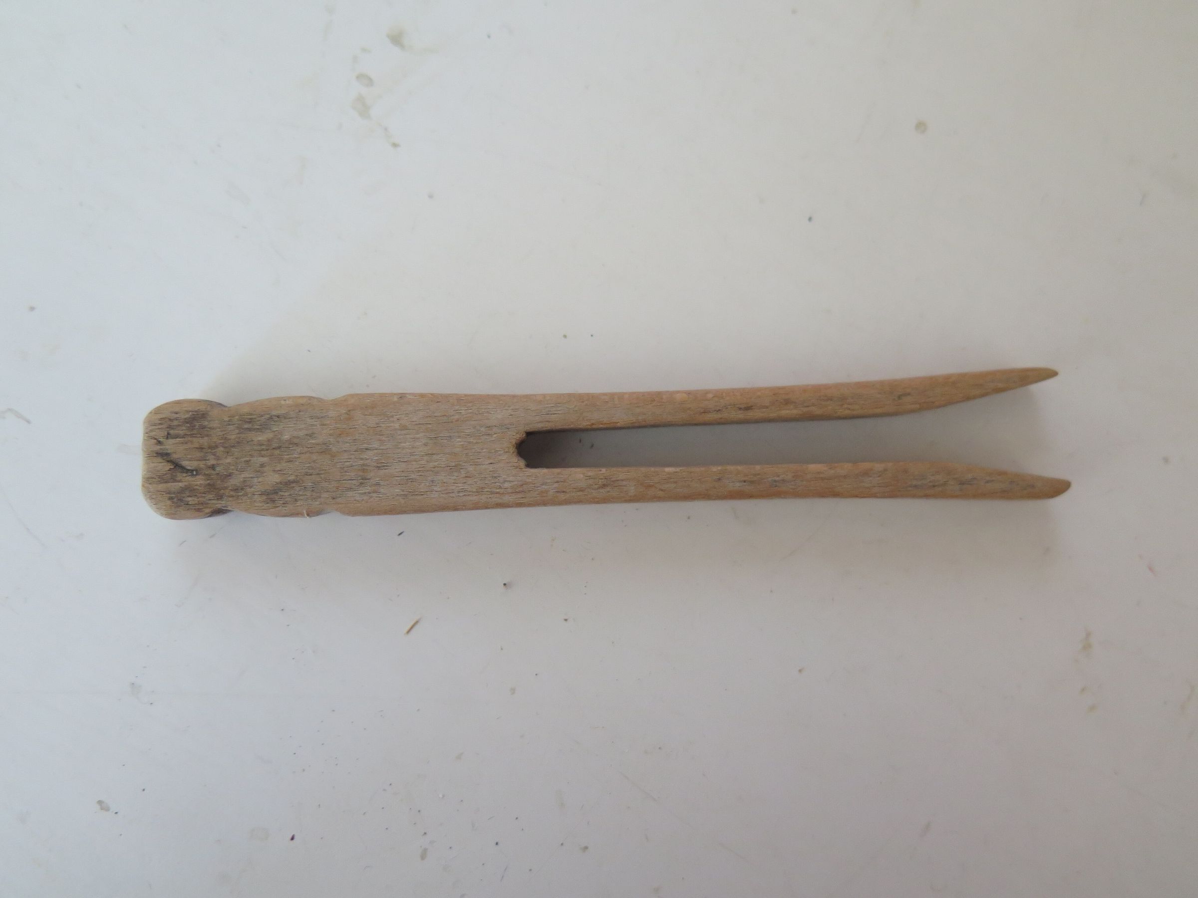 Wooden clothespin. The clothespin measures 0.25" (h) x 0.5" (w) x 4.5" (l).