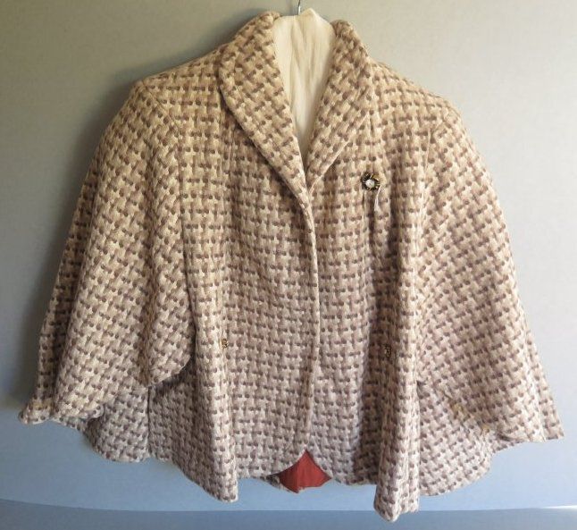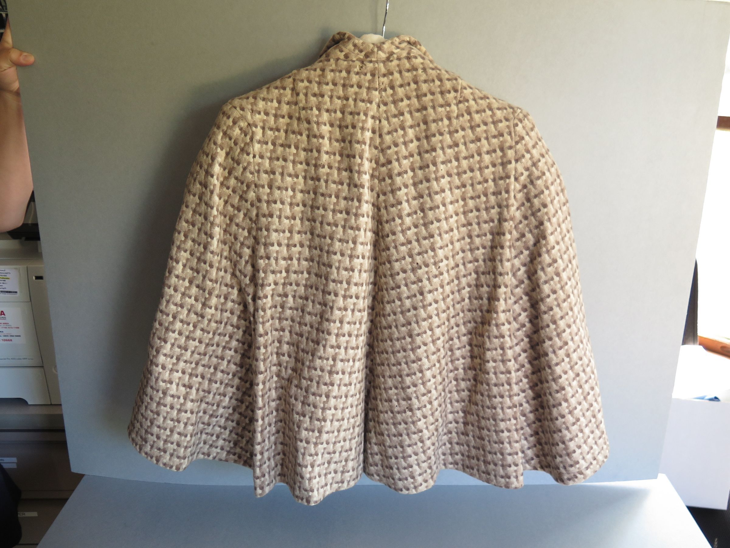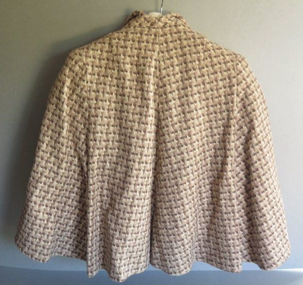 Tan girl's cape from California in the 1950s. The cape has a pattern to it that is a a variety of browns that is similar to houndstooth but slightly different. The cape measures 25" (l) x 30" (w).