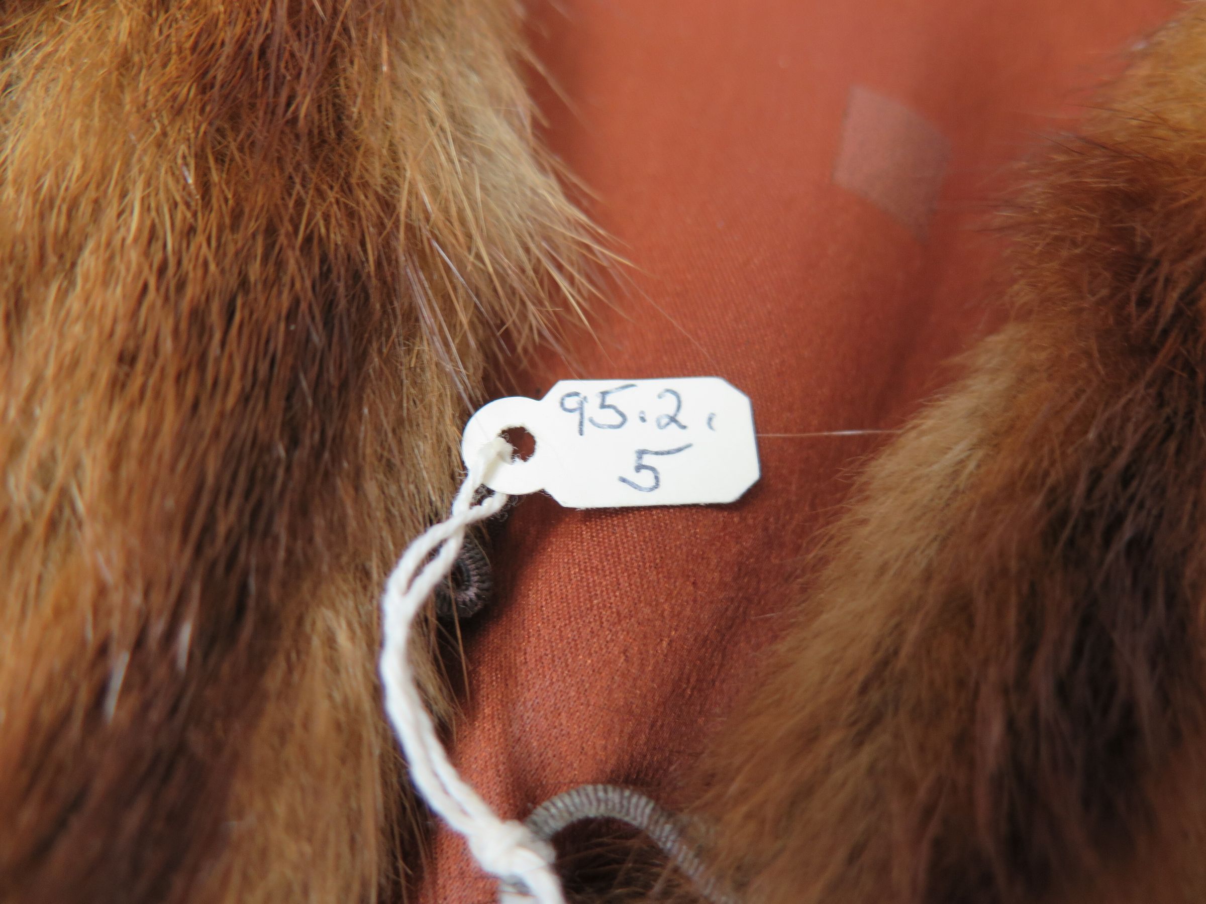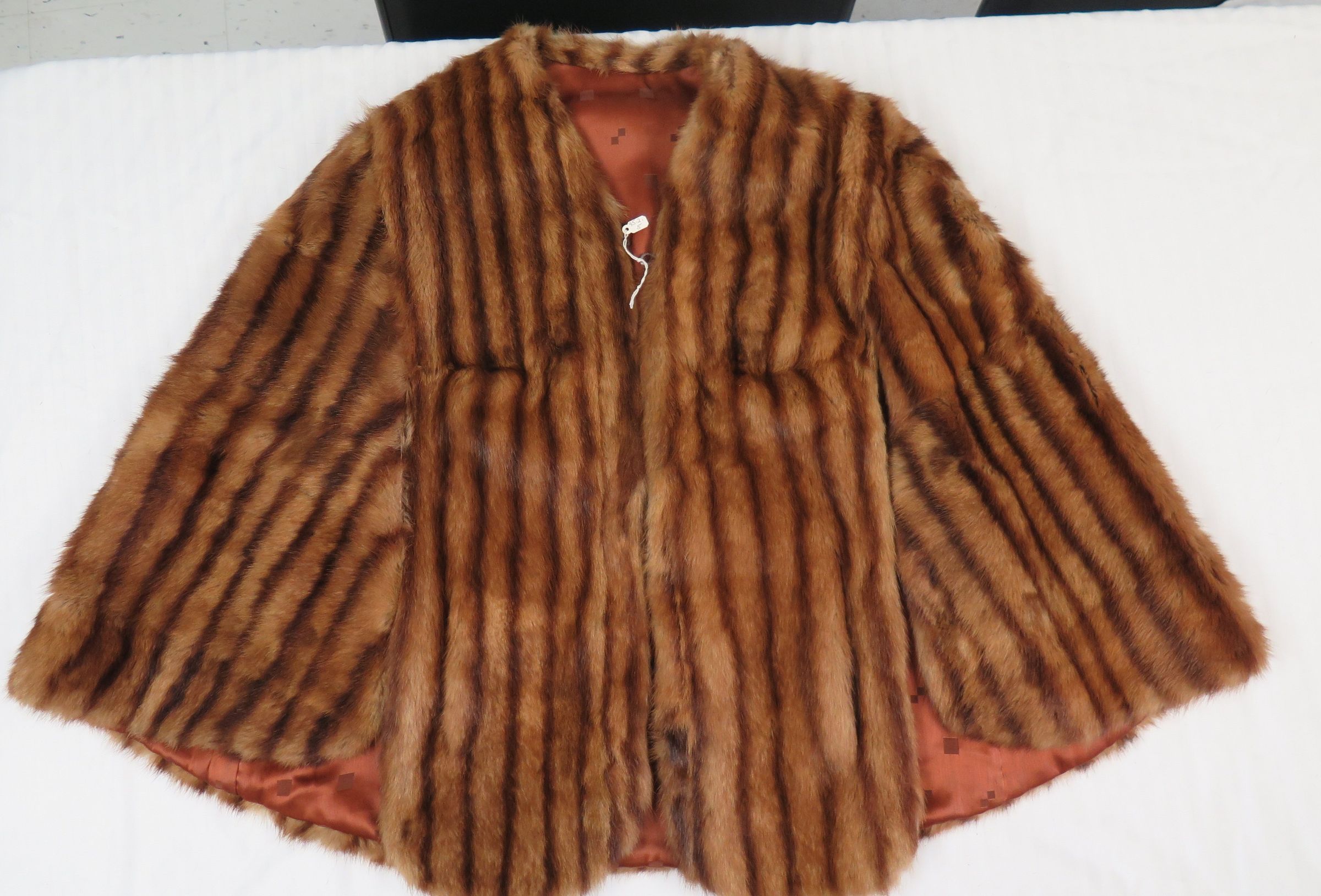 This is a fur jacket with brown and black vertical stripes. The jacket measures 27" (w) x 39" (l).